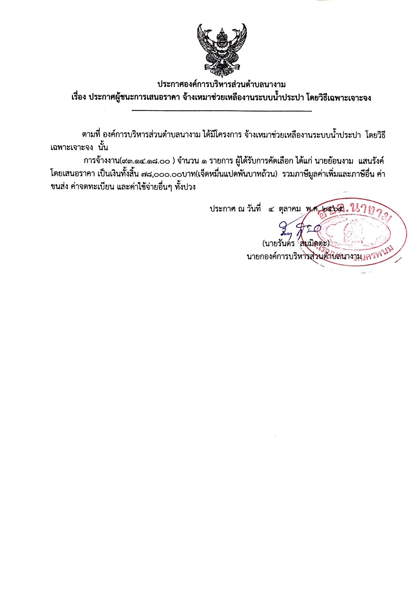 ประกาศผู้ชนะการเสนอราคา จ้างเหมาช่วยเหลืองานระบบน้ำประปา โดยวิธีเฉพาะเจาะจง
