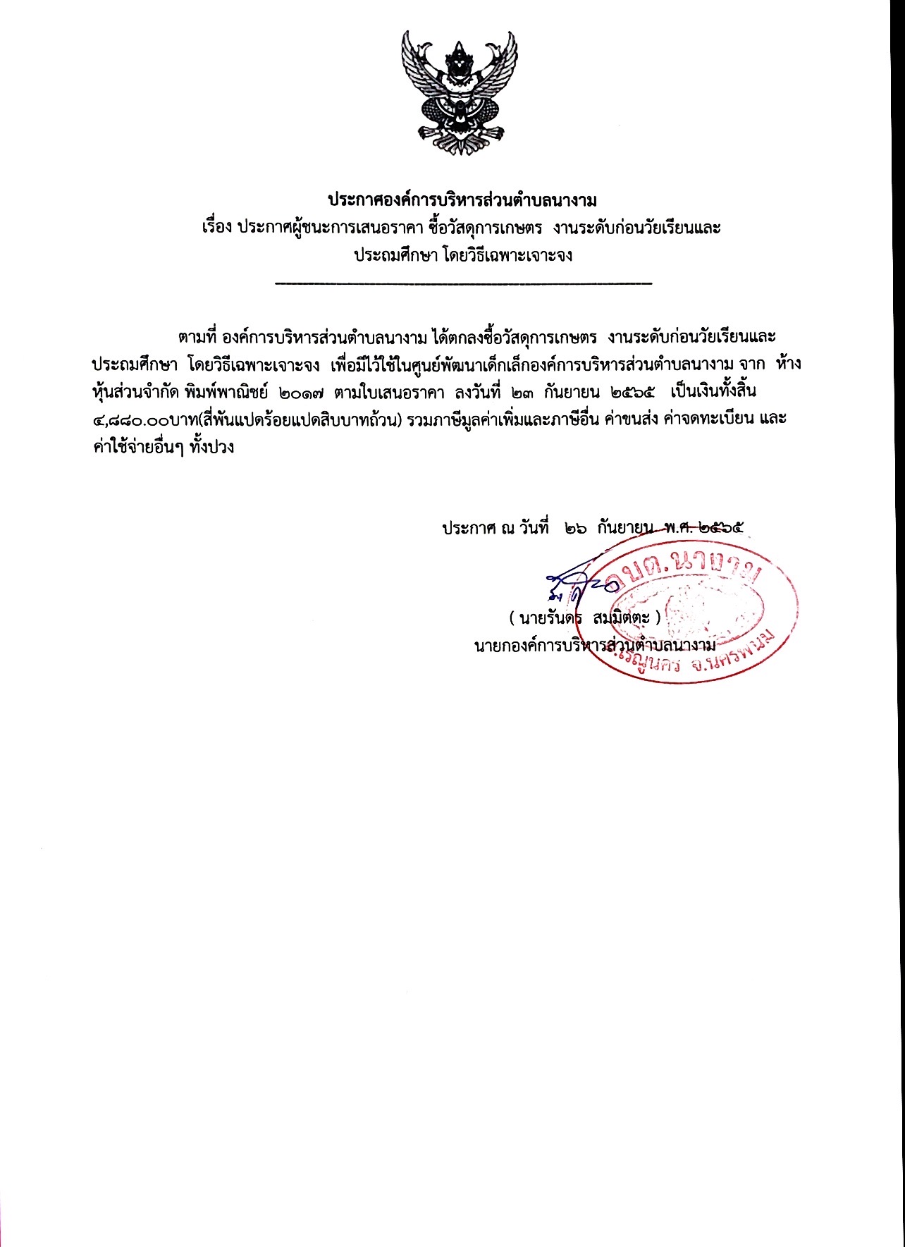 ประกาศผู้ชนะการเสนอราคา ซื้อวัสดุการเกษตร งานระดับก่อนวัยเรียนและ ประถมศึกษา โดยวิธีเฉพาะเจาะจง