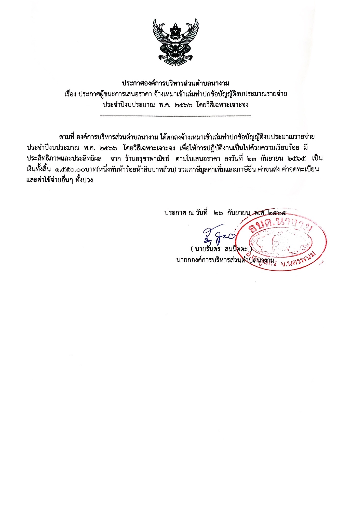 ประกาศผู้ชนะการเสนอราคา จ้างเหมาเข้าเล่มทำปกข้อบัญญัติงบประมาณรายจ่าย ประจำปีงบประมาณ พ.ศ. ๒๕๖6 โดยวิธีเฉพาะเจาะจง