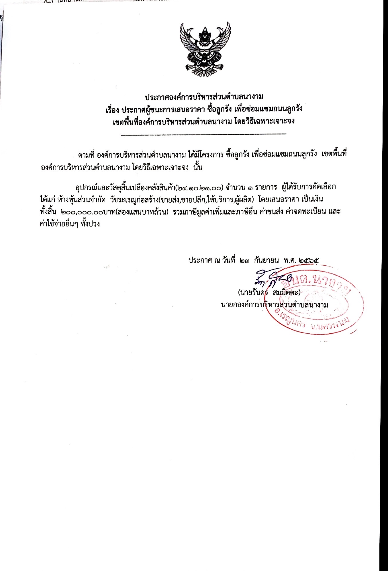 ประกาศผู้ชนะการเสนอราคา ซื้อลูกรัง เพื่อซ่อมแซมถนนลูกรัง เขตพื้นที่องค์การบริหารส่วนตำบลนางาม โดยวิธีเฉพาะเจาะจง