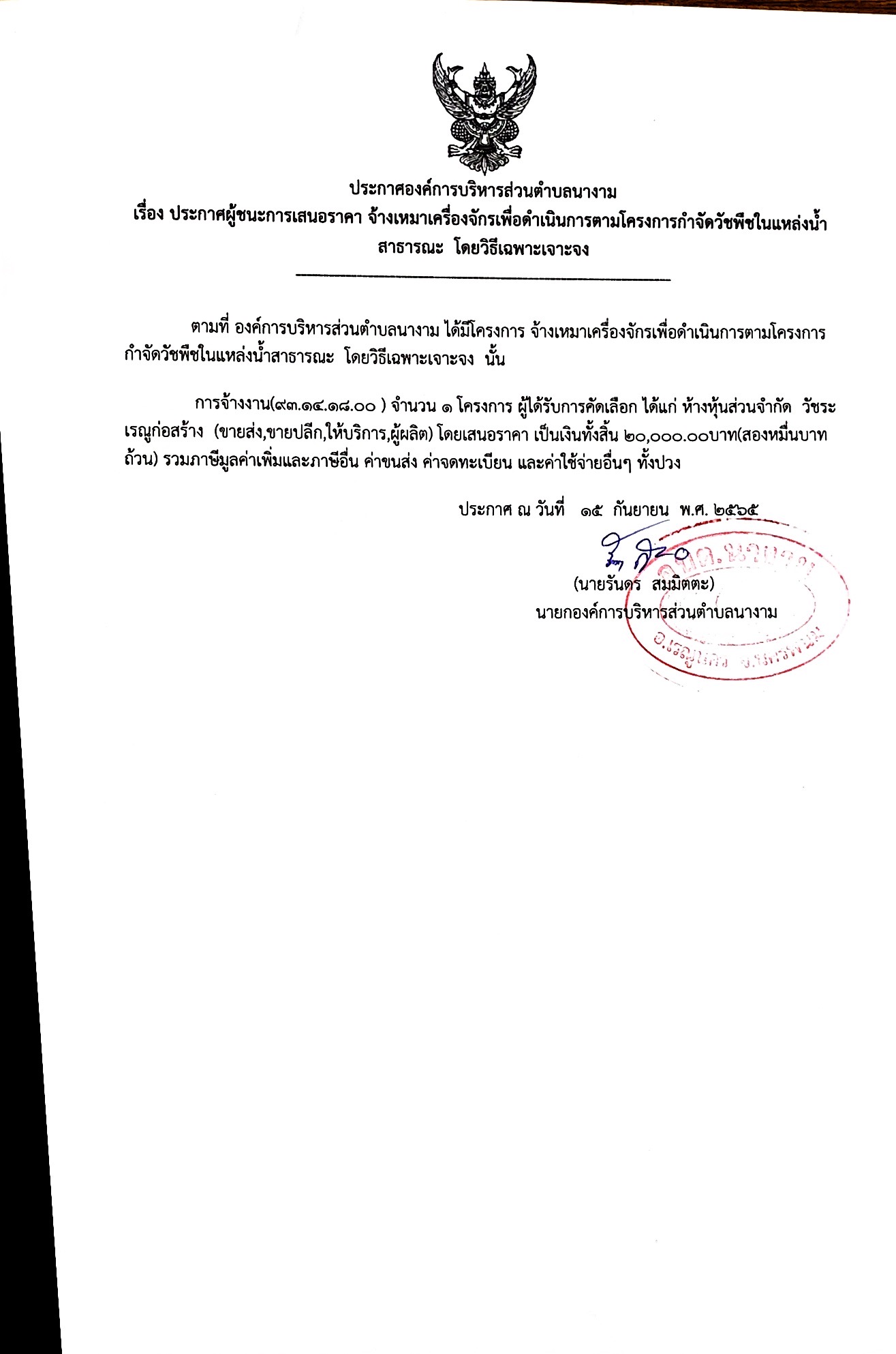 ประกาศผู้ชนะการเสนอราคา จ้างเหมาเครื่องจักรเพื่อดำเนินการตามโครงการกำจัดวัชพืชในแหล่งน้ำสาธารณะ โดยวิธีเฉพาะเจาะจง
