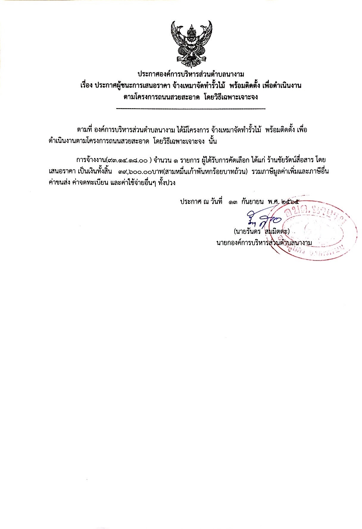 ประกาศผู้ชนะการเสนอราคา จ้างเหมาจัดทำรั้วไม้ พร้อมติดตั้ง เพื่อดำเนินงาน ตามโครงการถนนสวยสะอาด โดยวิธีเฉพาะเจาะจง