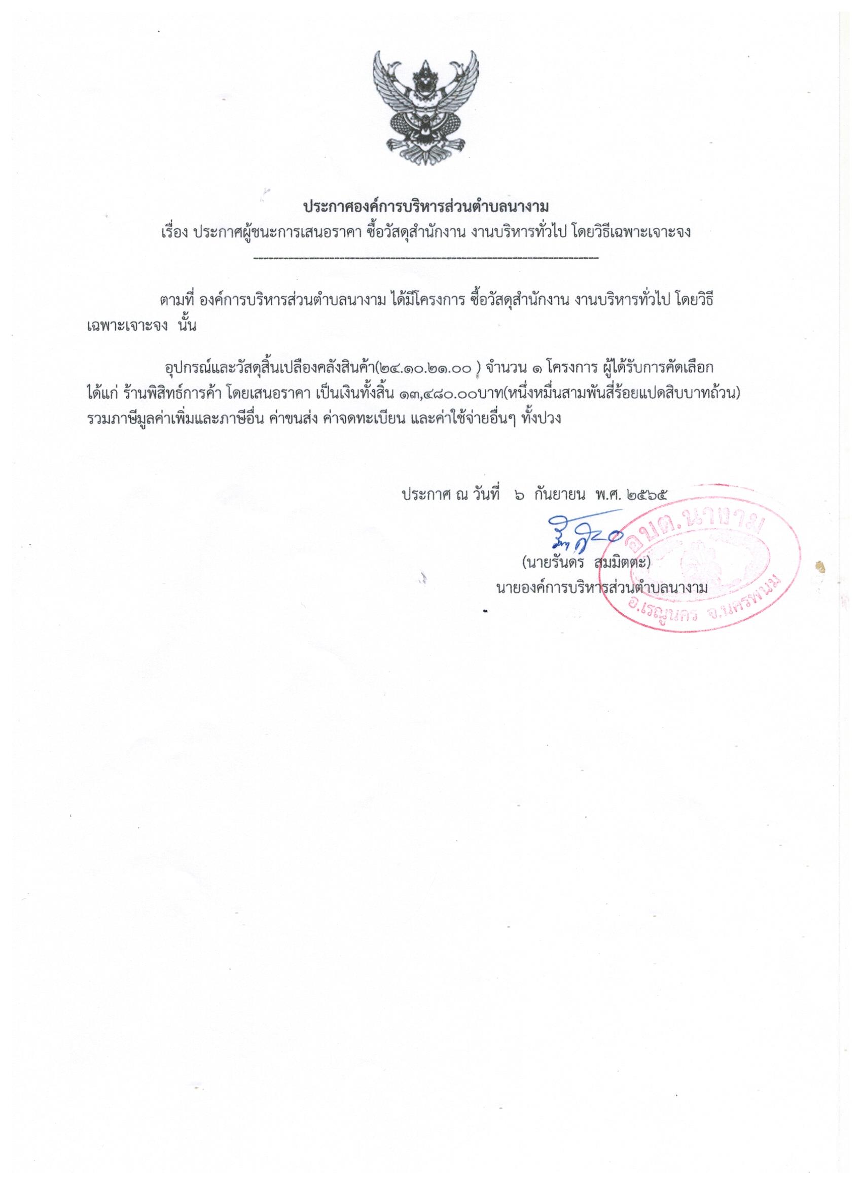 ประกาศผู้ชนะการเสนอราคา ซื้อวัสดุสำนักงาน งานบริหารทั่วไป โดยวิธีเฉพาะเจาะจง