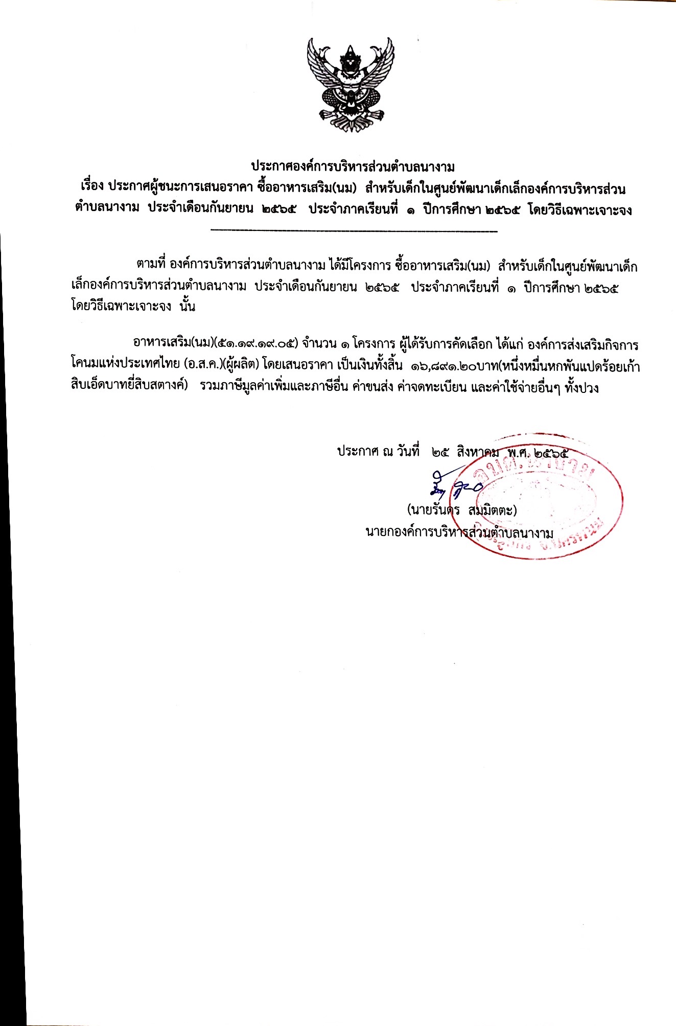 ชื่อเรื่อง : ประกาศผู้ชนะการเสนอราคา ซื้ออาหารเสริม(นม) สำหรับเด็กในศูนย์พัฒนาเด็กเล็กองค์การบริหารส่วนตำบลนางาม ประจำเดือนกันยายน ๒๕๖๕ ประจำภาคเรียนที่ ๑ ปีการศึกษา ๒๕๖๕ โดยวิธีเฉพาะเจาะจง