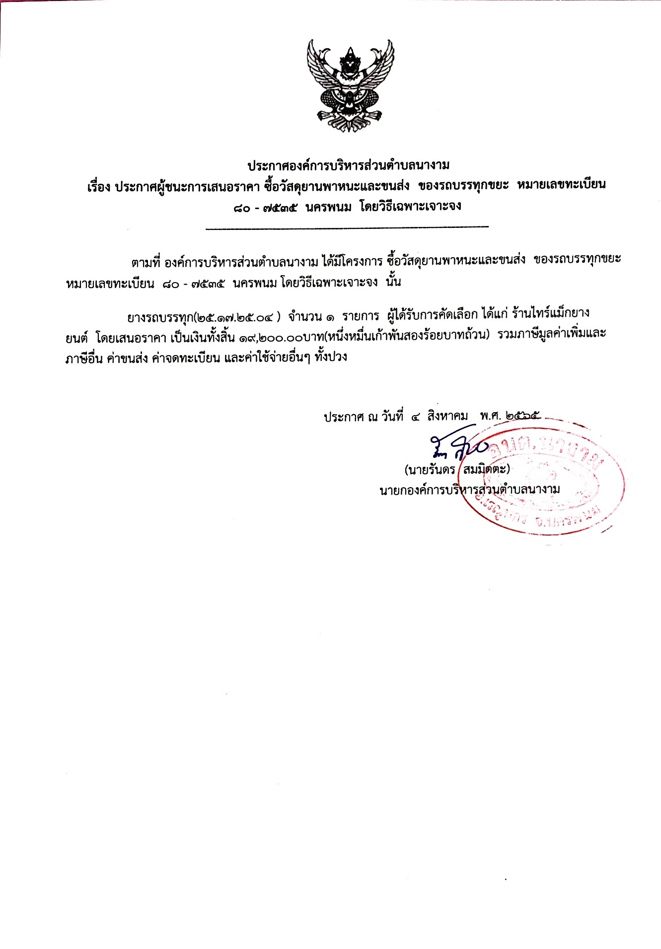 ประกาศผู้ชนะการเสนอราคา ซื้อวัสดุยานพาหนะและขนส่ง ของรถบรรทุกขยะ หมายเลขทะเบียน ๘๐ - ๗๕๓๕ นครพนม โดยวิธีเฉพาะเจาะจง