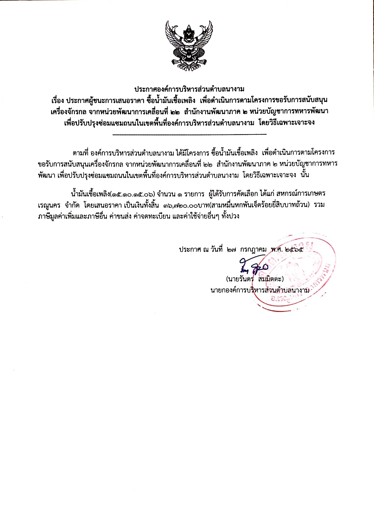 ชื่อเรื่อง : ประกาศผู้ชนะการเสนอราคา ซื้อน้ำมันเชื้อเพลิง เพื่อดำเนินการตามโครงการขอรับการสนับสนุนเครื่องจักรกล จากหน่วยพัฒนาการเคลื่อนที่ ๒๒ สำนักงานพัฒนาภาค ๒ หน่วยบัญชาการทหารพัฒนา เพื่อปรับปรุงซ่อมแซมถนนในเขตพื้นที่องค์การบริหารส่วนตำบลนางาม โดยวิธีเฉพาะเจาะจง