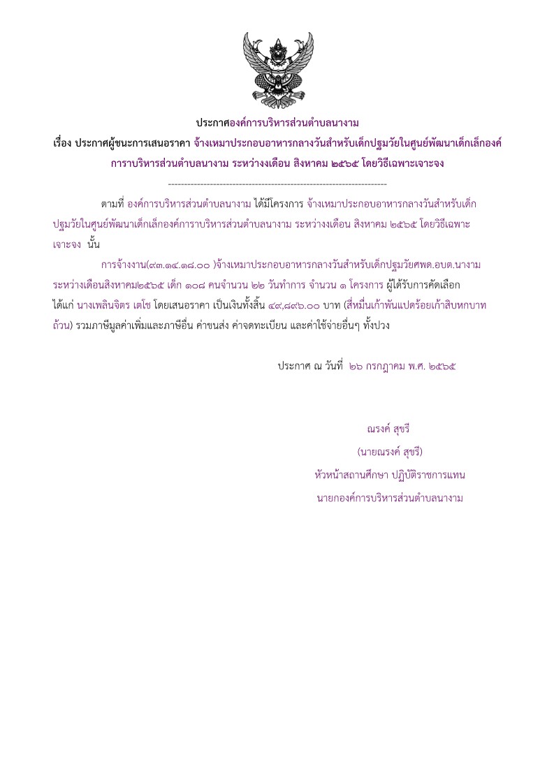 ประกาศผู้ชนะการเสนอราคาจ้างประกอบอาหารกลางวันศูนย์พัฒนาเด็กเล็กองค์การบริหารส่วนตำบลนางามเดือนสิงหาคม2565