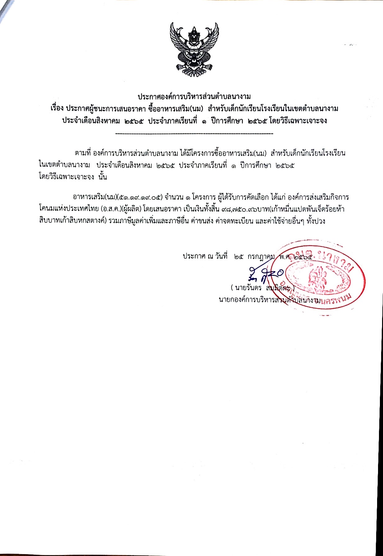 ชื่อเรื่อง : ประกาศผู้ชนะการเสนอราคา ซื้ออาหารเสริม(นม) สำหรับเด็กนักเรียนโรงเรียนในเขตตำบลนางาม ประจำเดือนสิงหาคม ๒๕๖๕ ประจำภาคเรียนที่ ๑ ปีการศึกษา ๒๕๖๕ โดยวิธีเฉพาะเจาะจง