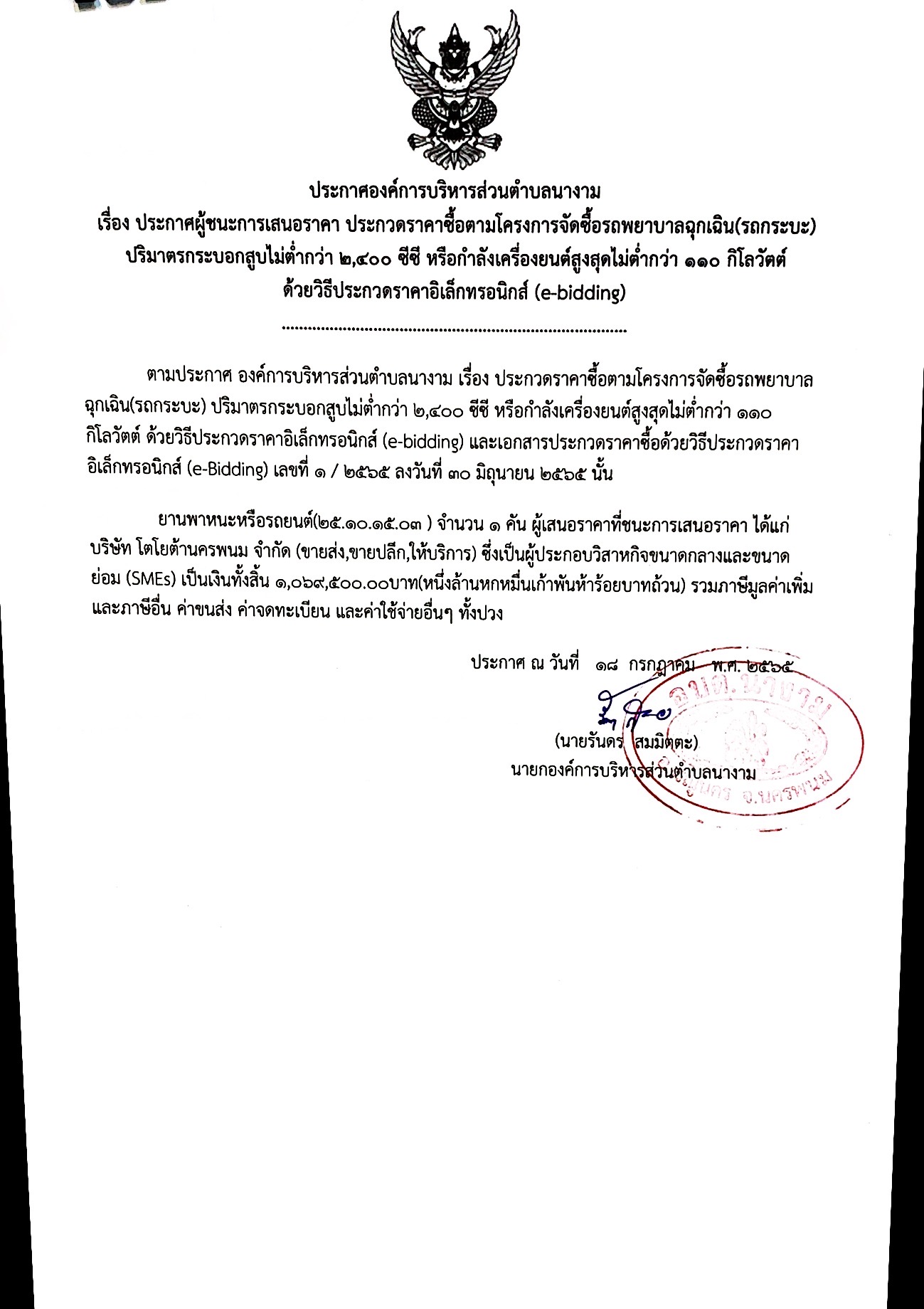 ชื่อเรื่อง : ประกาศผู้ชนะการเสนอราคา ประกวดราคาซื้อตามโครงการจัดซื้อรถพยาบาลฉุกเฉิน(รถกระบะ) ปริมาตรกระบอกสูบไม่ต่ำกว่า ๒,๔๐๐ ซีซี หรือกำลังเครื่องยนต์สูงสุดไม่ต่ำกว่า ๑๑๐ กิโลวัตต์ ด้วยวิธีประกวดราคาอิเล็กทรอนิกส์ (e-bidding)