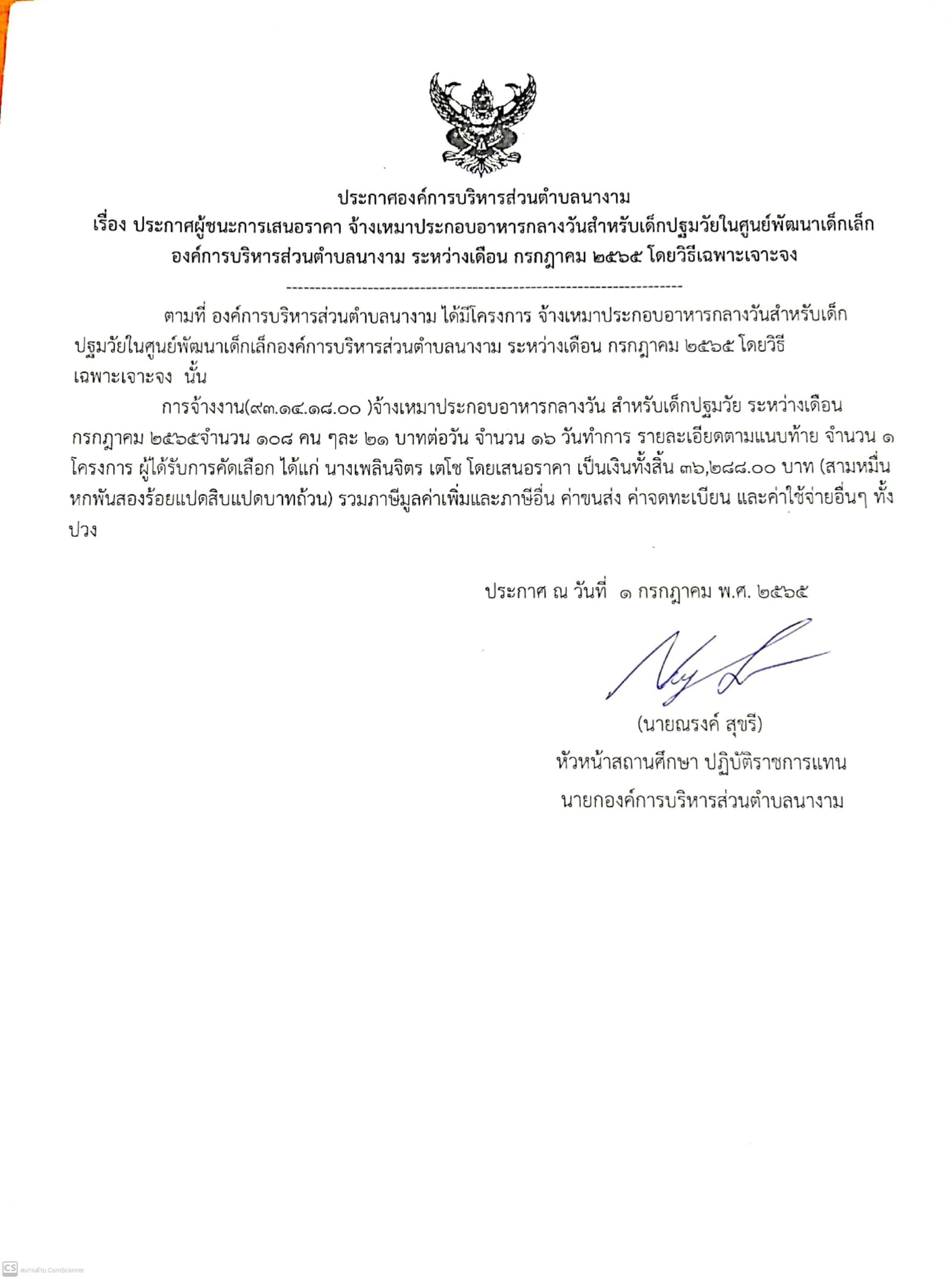 ประกาศผู้ชนะการเสนอราคาจ้างประกอบอาหารกลางวันศูนย์พัฒนาเด็กเล็กองค์การบริหารส่วนตำบลนางามเดือนกรกฎาคม2565