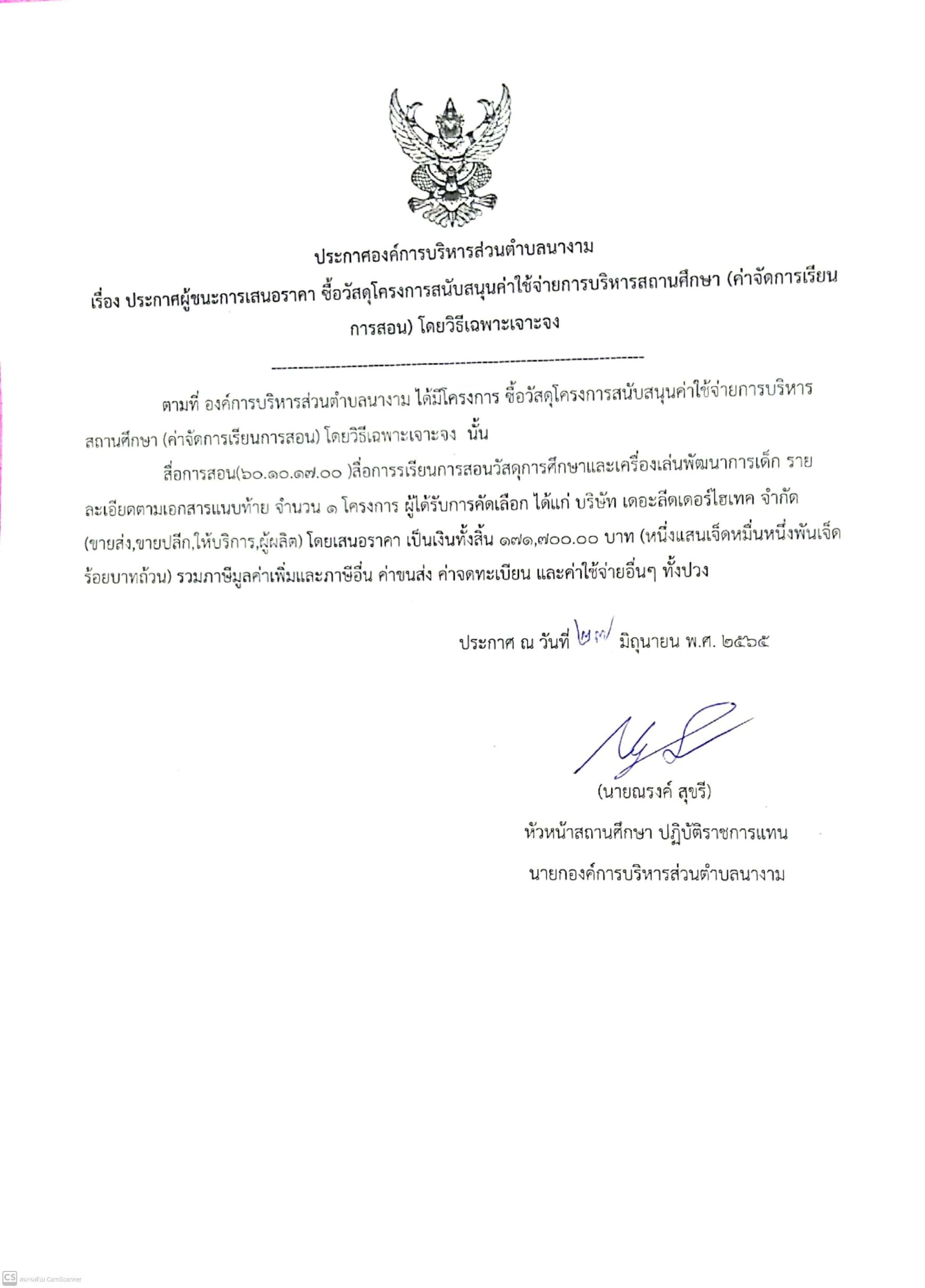 ประกาศผู้ชนะการเสนอราคาซื้อวัสดุโครงการสนับสนุนค่าใช้จ่ายการบริหารสถานศึกษา(ค่าจัดการเรียนการสอน)โดยวิธีเฉพาะเจาะจง