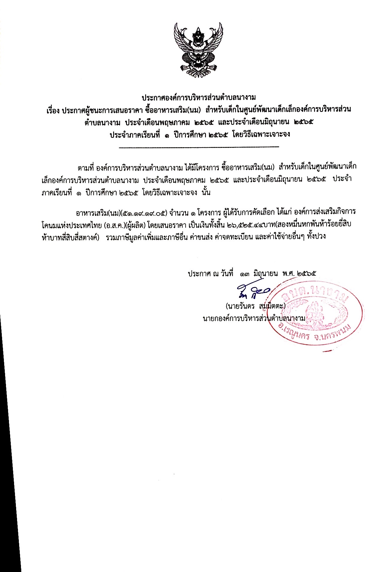 ชื่อเรื่อง : ประกาศผู้ชนะการเสนอราคา ซื้ออาหารเสริม(นม) สำหรับเด็กในศูนย์พัฒนาเด็กเล็กองค์การบริหารส่วนตำบลนางาม ประจำเดือนพฤษภาคม ๒๕๖๕ และประจำเดือนมิถุนายน ๒๕๖๕ ประจำภาคเรียนที่ ๑ ปีการศึกษา ๒๕๖๕ โดยวิธีเฉพาะเจาะจง