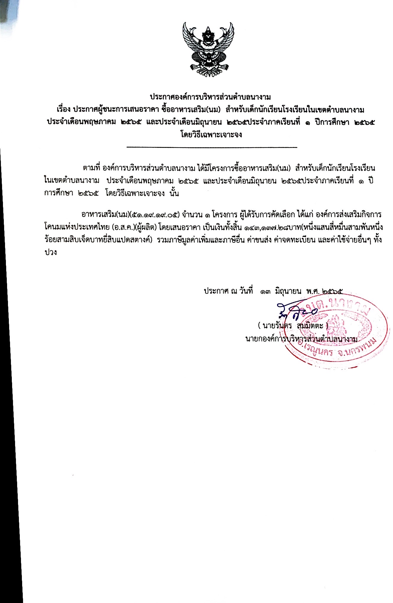 ชื่อเรื่อง : ประกาศผู้ชนะการเสนอราคา ซื้ออาหารเสริม(นม) สำหรับเด็กนักเรียนโรงเรียนในเขตตำบลนางาม ประจำเดือนพฤษภาคม ๒๕๖๕ และประจำเดือนมิถุนายน ๒๕๖๕ประจำภาคเรียนที่ ๑ ปีการศึกษา ๒๕๖๕ โดยวิธีเฉพาะเจาะจง