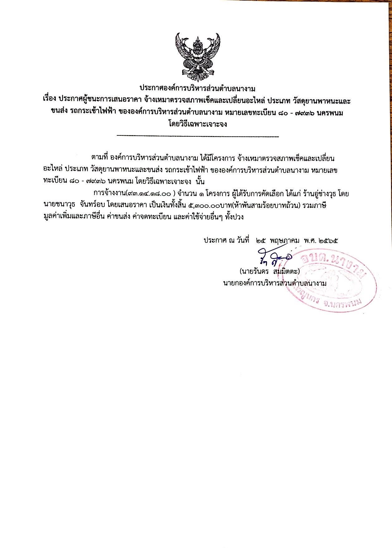 ชื่อเรื่อง : ประกาศผู้ชนะการเสนอราคา จ้างเหมาตรวจสภาพเช็คและเปลี่ยนอะไหล่ ประเภท วัสดุยานพาหนะและขนส่ง รถกระเช้าไฟฟ้า ขององค์การบริหารส่วนตำบลนางาม หมายเลขทะเบียน ๘๐ - ๗๙๓๖ นครพนม โดยวิธีเฉพาะเจาะจง
