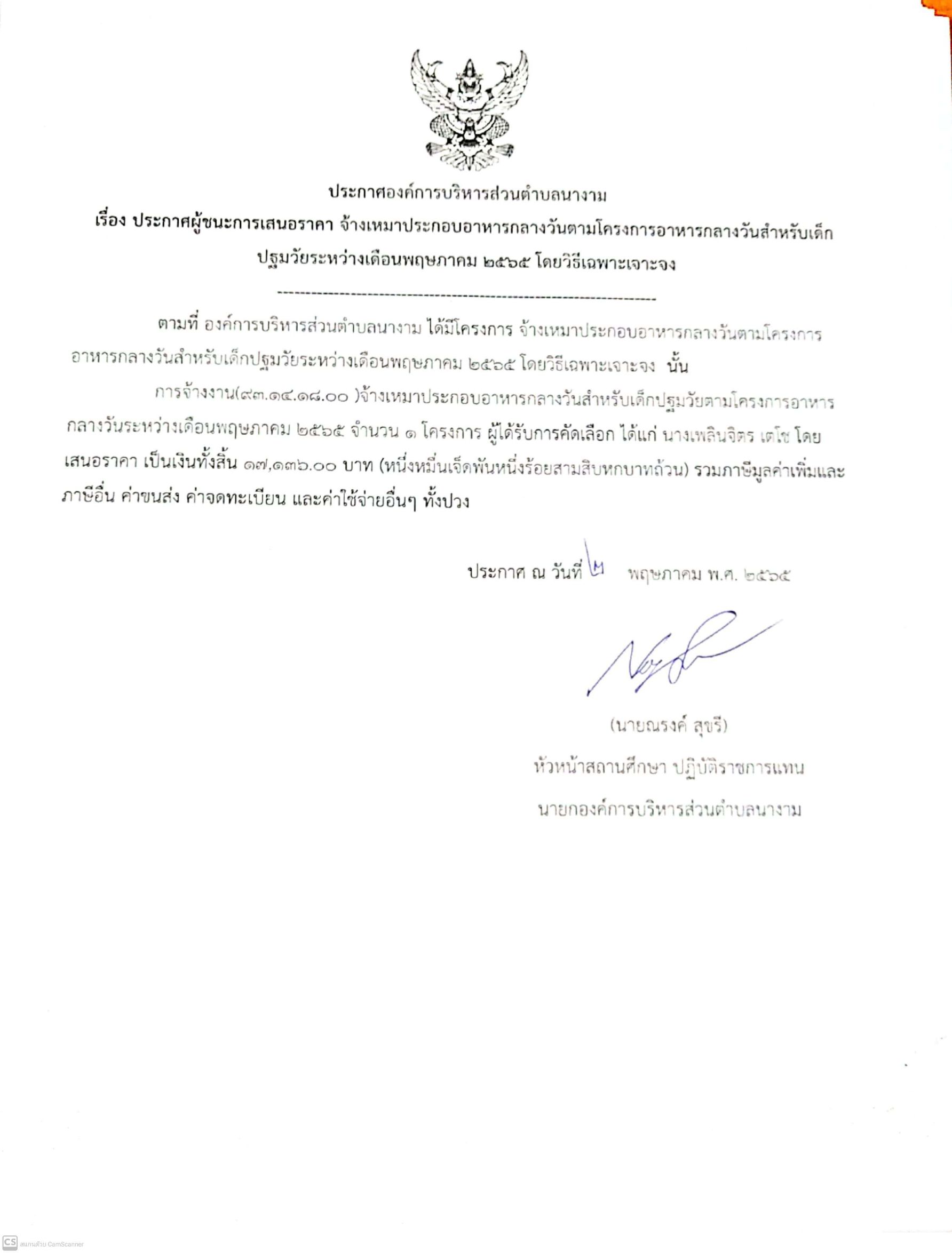 ประกาศผู้ชนะการเสนอราคาจ้างประกอบอาหารกลางวันศูนย์พัฒนาเด็กเล็กองค์การบริหารส่วนตำบลนางามเดือนพฤษภาคม2564โดยวิธีเฉพาะเจาะจง