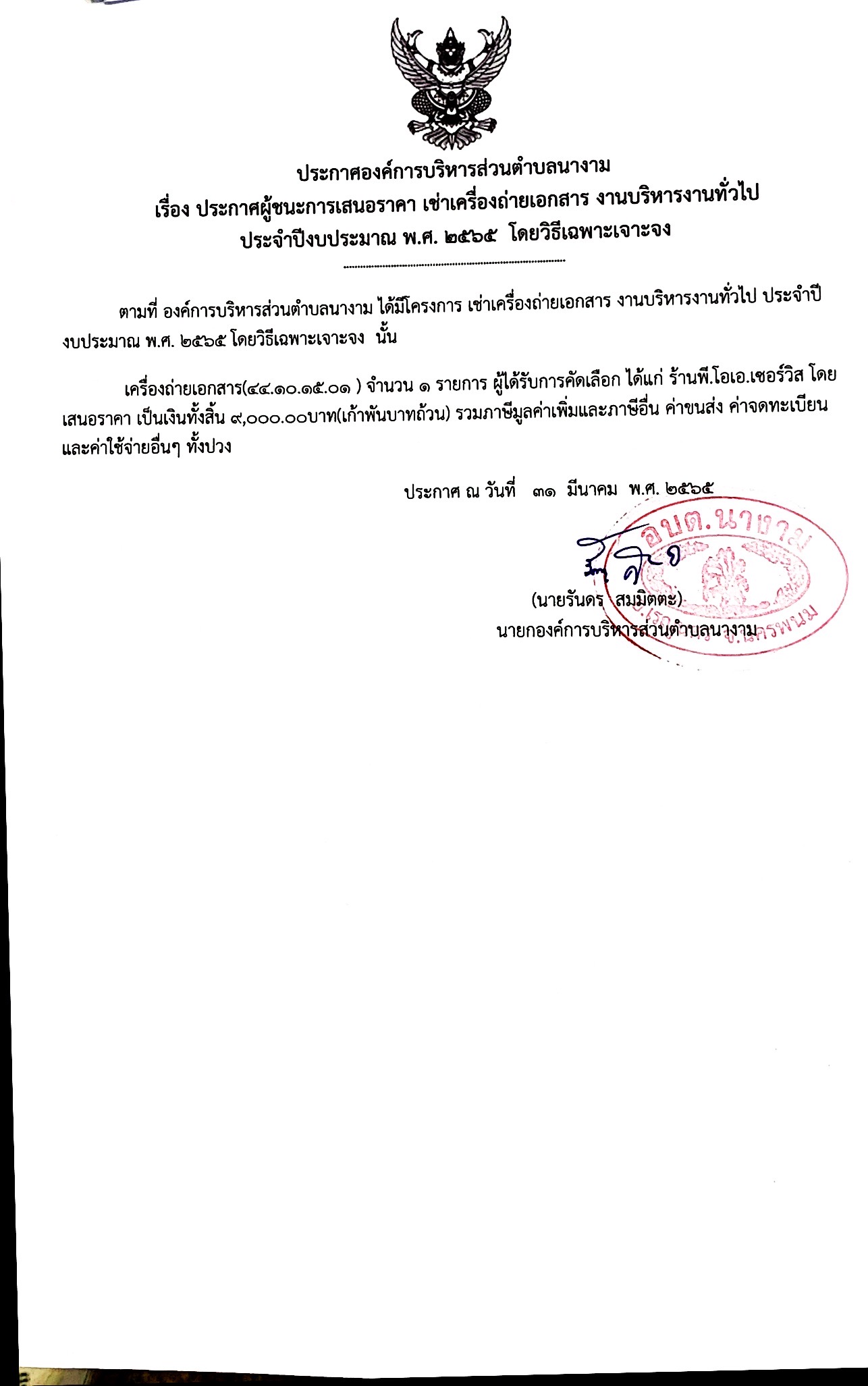 ประกาศผู้ชนะการเสนอราคา เช่าเครื่องถ่ายเอกสาร งานบริหารงานทั่วไป ประจำปีงบประมาณ พ.ศ. ๒๕๖๕ โดยวิธีเฉพาะเจาะจง