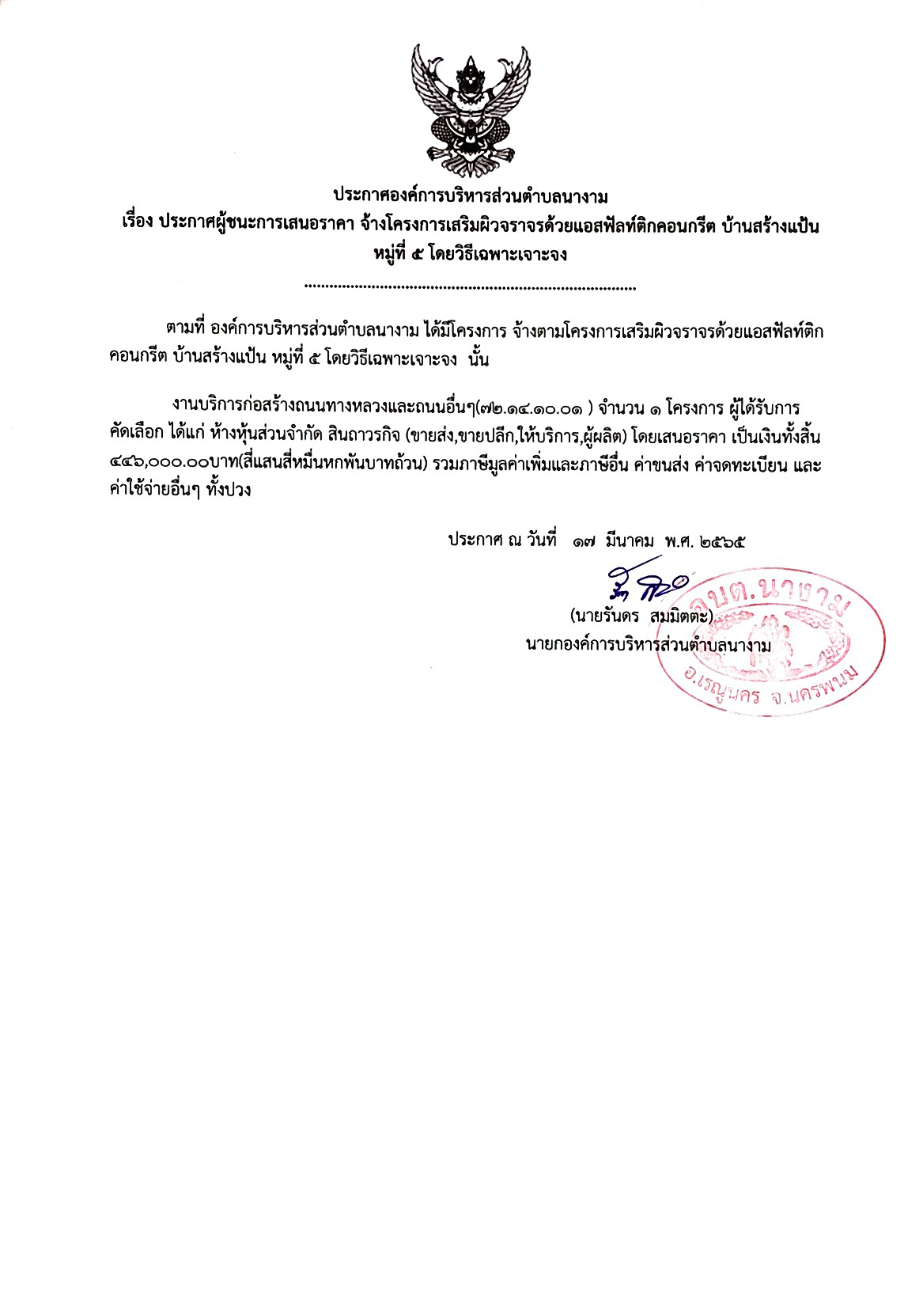 ประกาศผู้ชนะการเสนอราคา จ้างโครงการเสริมผิวจราจรด้วยแอสฟัลท์ติกคอนกรีต บ้านสร้างแป้น หมู่ที่ 5 โดยวิธีเฉพาะเจาะจง