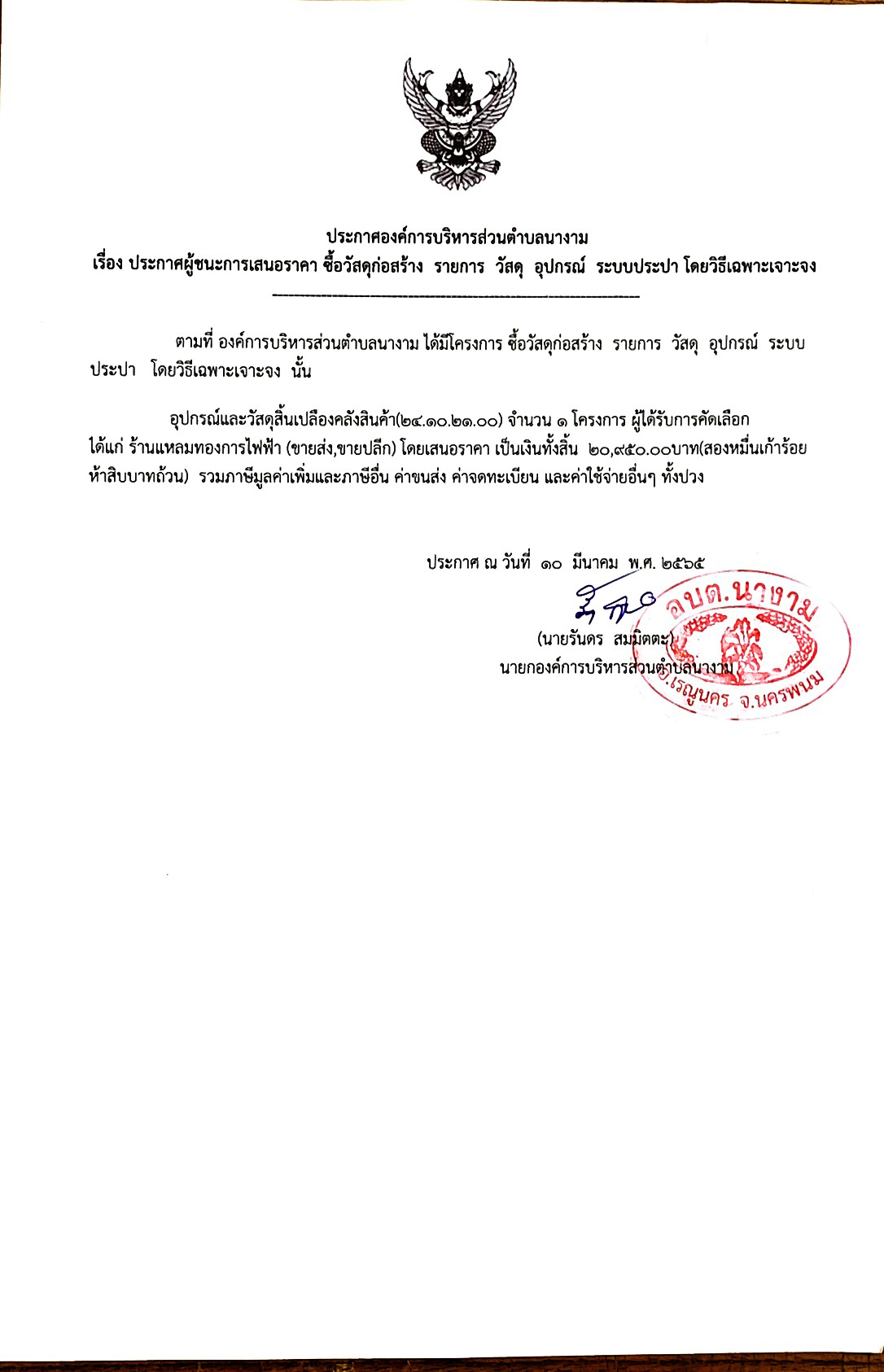 ชื่อเรื่อง : ประกาศผู้ชนะการเสนอราคา ซื้อวัสดุก่อสร้าง รายการ วัสดุ อุปกรณ์ ระบบประปา โดยวิธีเฉพาะเจาะจง
