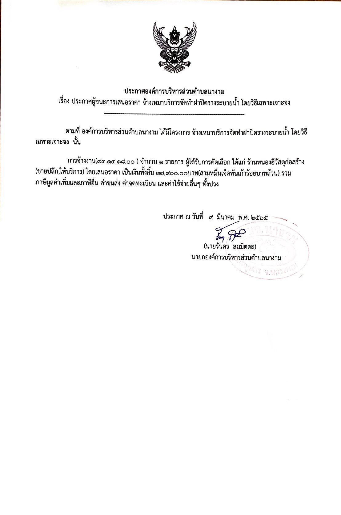 ประกาศผู้ชนะการเสนอราคา จ้างเหมาบริการจัดทำฝาปิดรางระบายน้ำ โดยวิธีเฉพาะเจาะจง