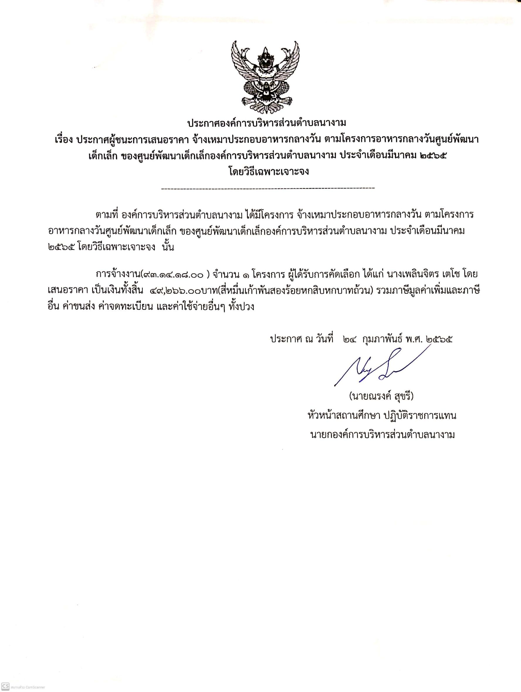 ประกาศผู้ชนะการเสนอราคาจ้างประกอบอาหารกลางวันศูนย์พัฒนาเด็กเล็กองค์การบริหารส่วนตำบลนางามเดือนมีนาคม2565