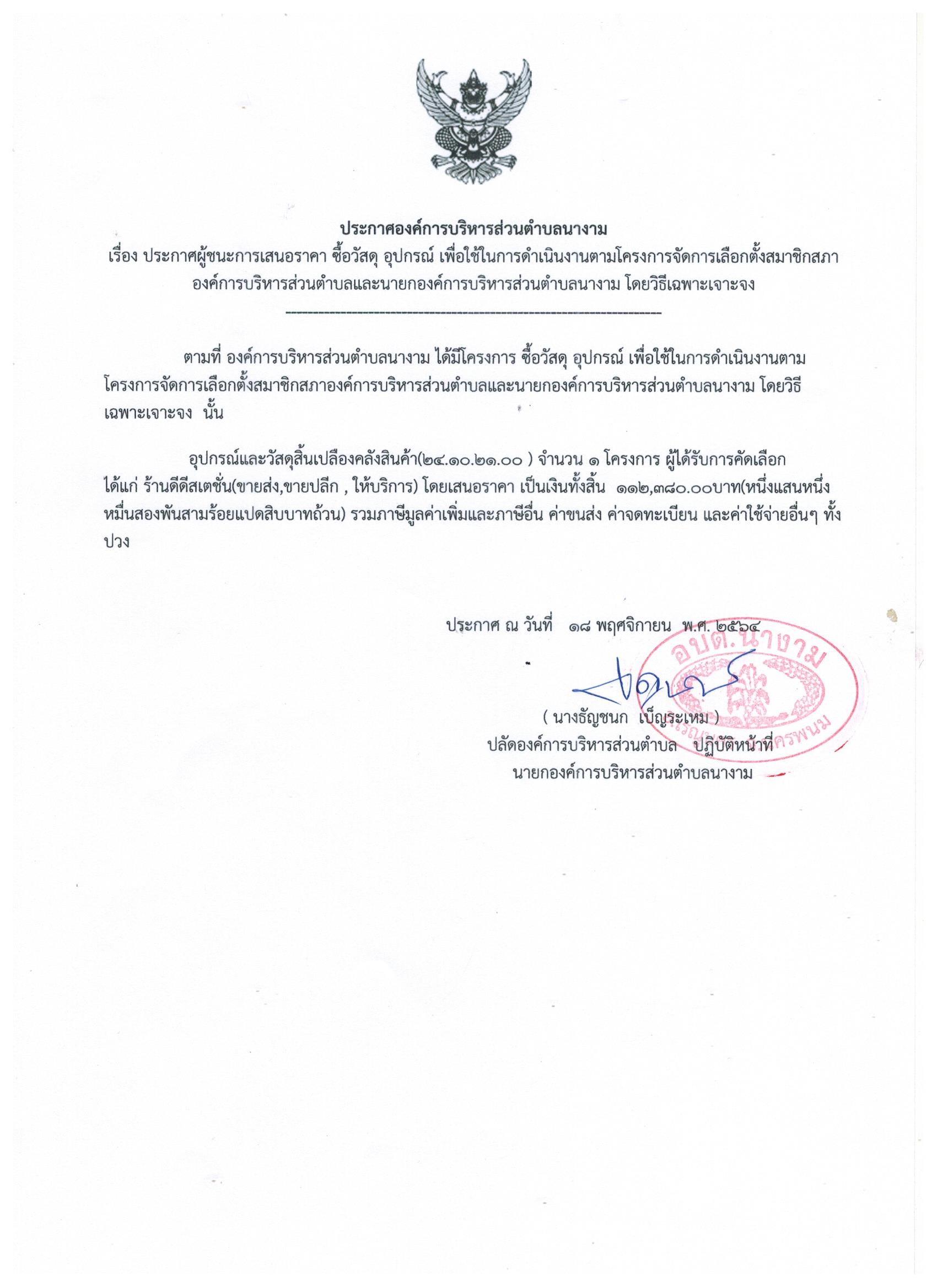 ชื่อเรื่อง : ประกาศผู้ชนะการเสนอราคา ซื้อวัสดุ อุปกรณ์ เพื่อใช้ในการดำเนินงานตามโครงการจัดการเลือกตั้งสมาชิกสภาองค์การบริหารส่วนตำบลและนายกองค์การบริหารส่วนตำบลนางาม โดยวิธีเฉพาะเจาะจง