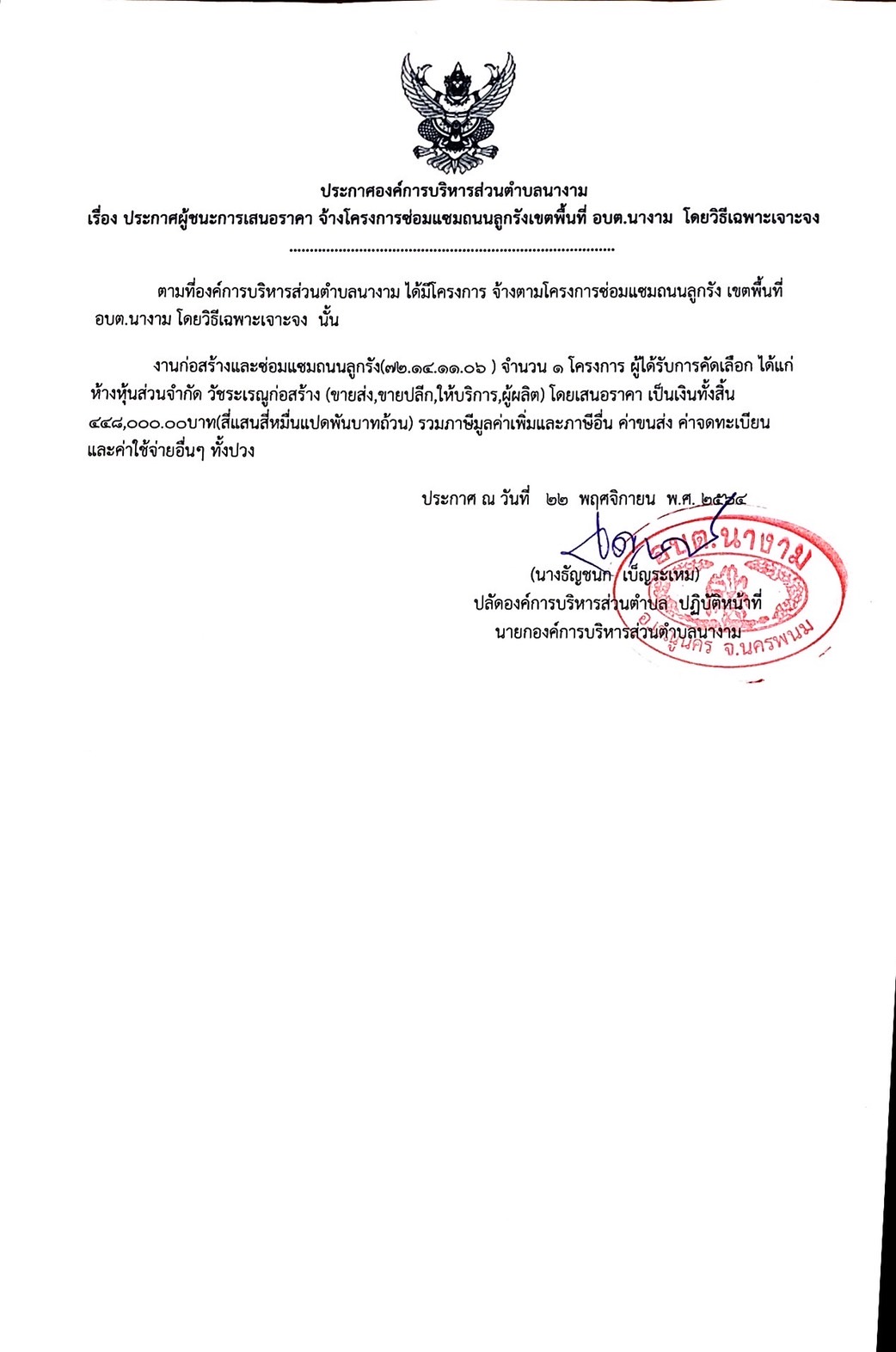 ประกาศผู้ชนะการเสนอราคา จ้างโครงการซ่อมแซมถนนลูกรังเขตพื้นที่ อบต.นางาม โดยวิธีเฉพาะเจาะจง