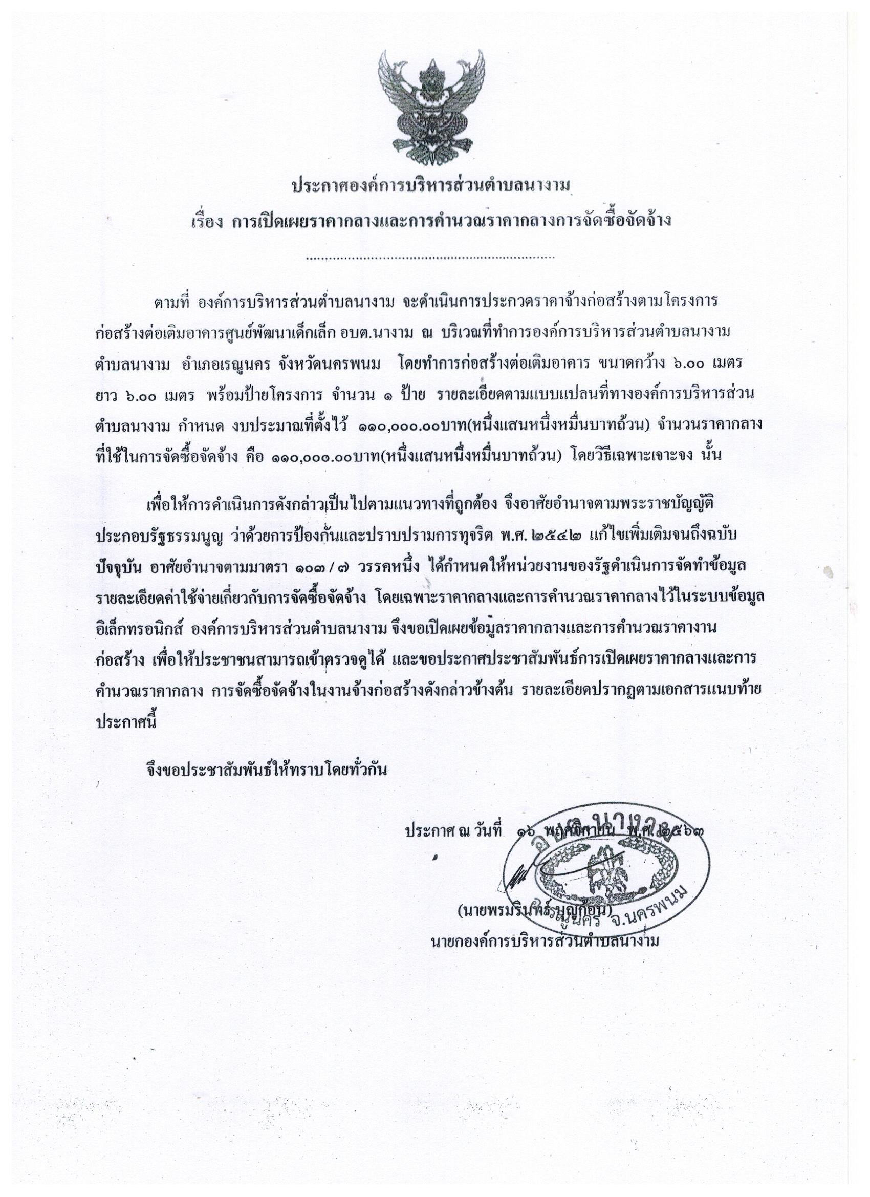 ประชาสัมพันธ์การเปิดเผยราคากลางโครงการก่อสร้างต่อเติมอาคารศูนย์พัฒนาเด็กเล็ก อบต.นางาม
