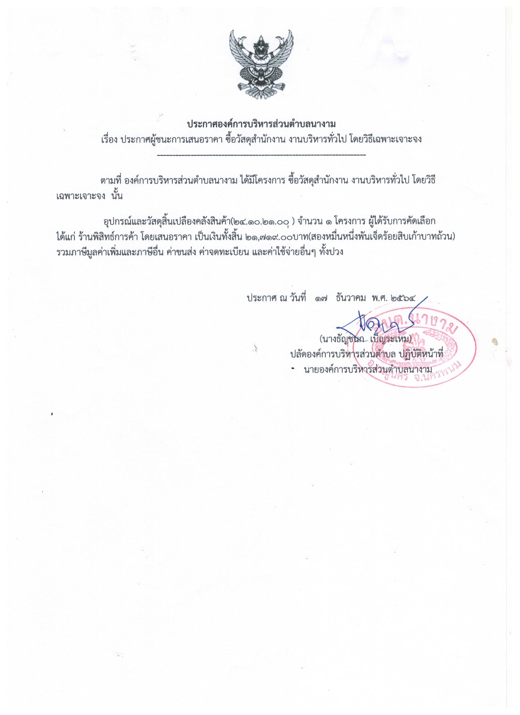 ชื่อเรื่อง : ประกาศผู้ชนะการเสนอราคา ซื้อวัสดุสำนักงาน งานบริหารทั่วไป โดยวิธีเฉพาะเจาะจง