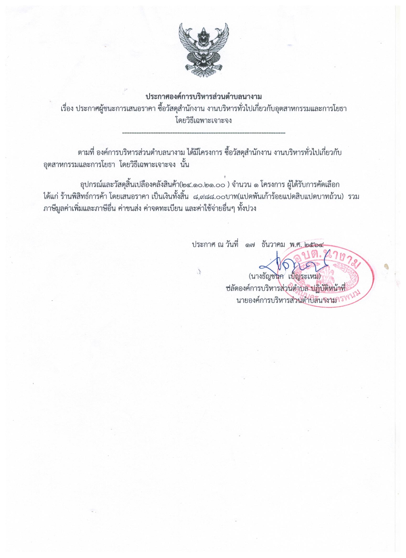 ประกาศผู้ชนะการเสนอราคา ซื้อวัสดุสำนักงาน งานบริหารทั่วไปเกี่ยวกับอุตสาหกรรมและการโยธา โดยวิธีเฉพาะเจาะจง