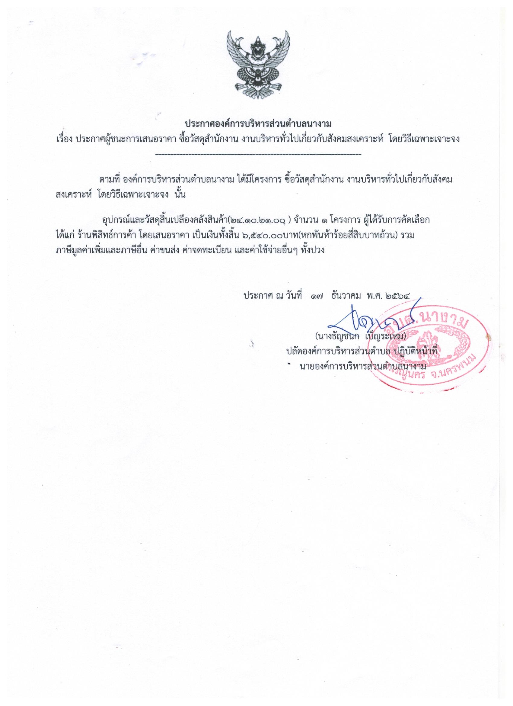 ประกาศผู้ชนะการเสนอราคา ซื้อวัสดุสำนักงาน งานบริหารทั่วไปเกี่ยวกับสังคมสงเคราะห์ โดยวิธีเฉพาะเจาะจง