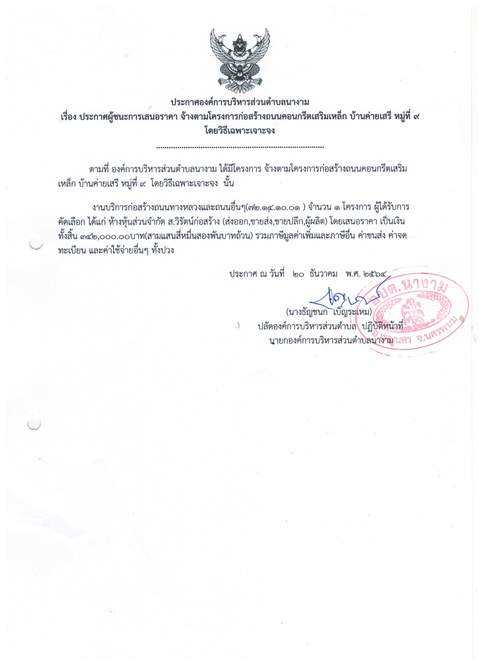 ประกาศผู้ชนะการเสนอราคา จ้างตามโครงการก่อสร้างถนนคอนกรีตเสริมเหล็ก บ้านค่ายเสรี หมู่ที่ 9 โดยวิธีเฉพาะเจาะจง