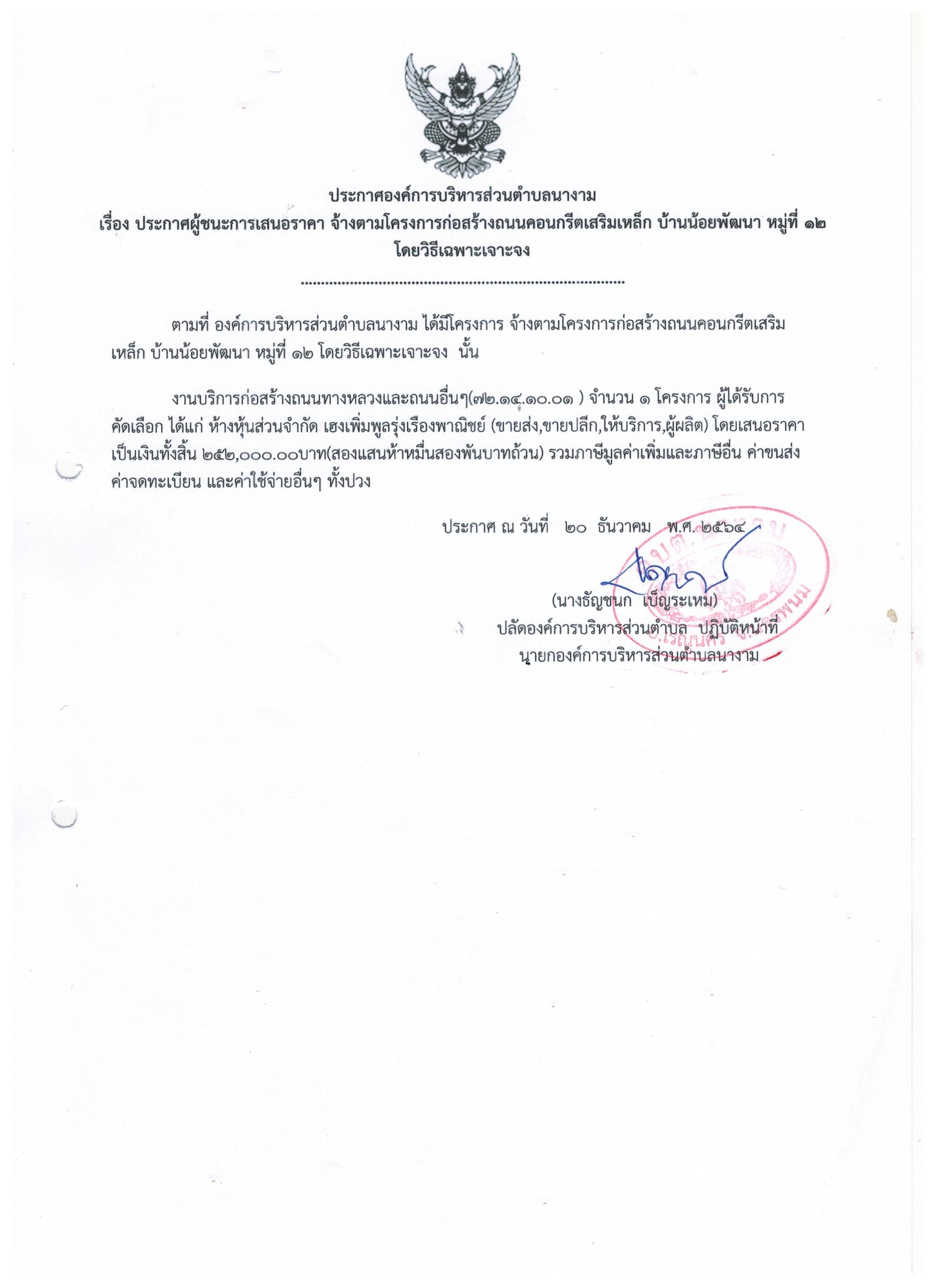 ประกาศผู้ชนะการเสนอราคา จ้างตามโครงการก่อสร้างถนนคอนกรีตเสริมเหล็ก บ้านน้อยพัฒนา หมู่ที่ 12 โดยวิธีเฉพาะเจาะจง