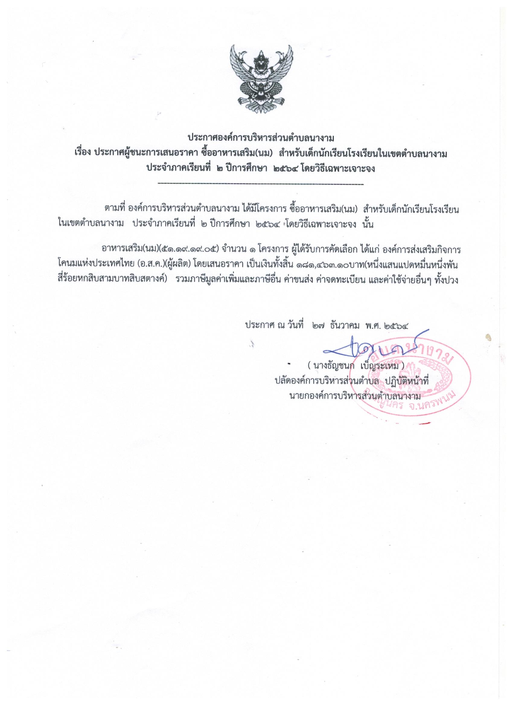 ชื่อเรื่อง : ประกาศผู้ชนะการเสนอราคา ซื้ออาหารเสริม(นม) สำหรับเด็กนักเรียนโรงเรียนในเขตตำบลนางาม ประจำภาคเรียนที่ 2 ปีการศึกษา 2564 โดยวิธีเฉพาะเจาะจง