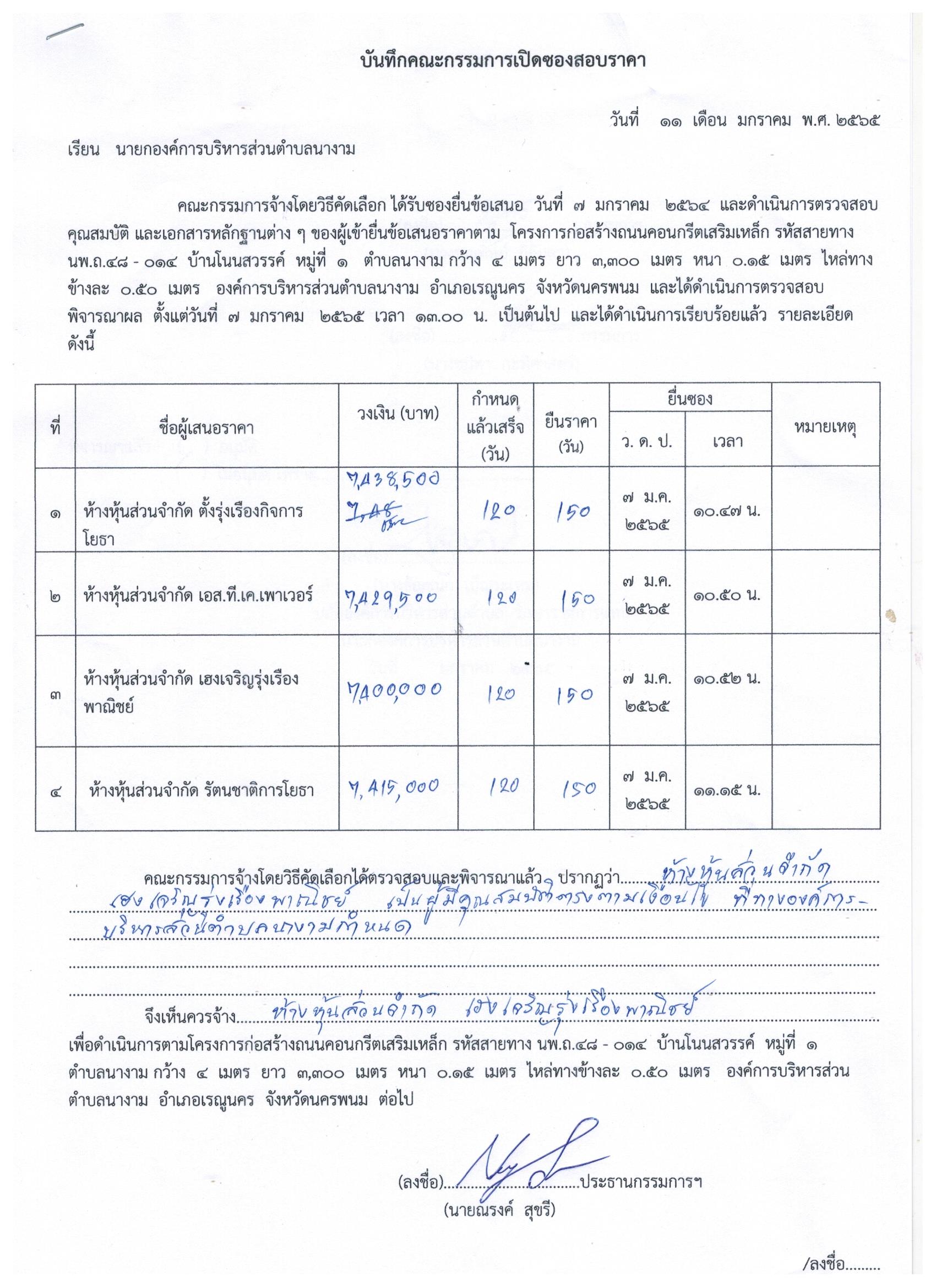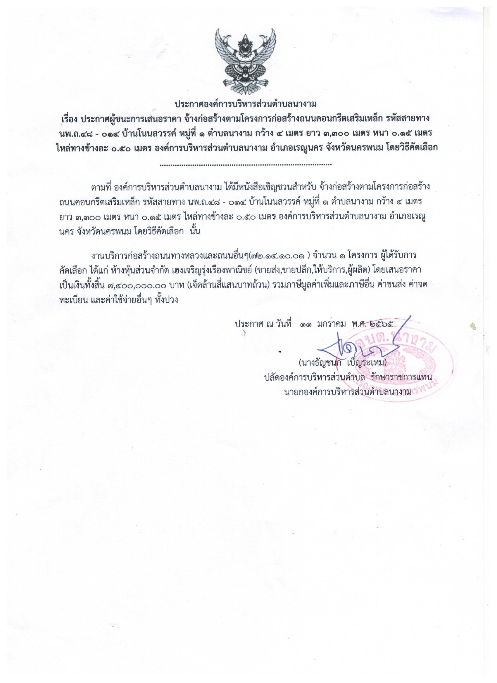 ชื่อเรื่อง : ประกาศผู้ชนะการเสนอราคา จ้างก่อสร้างตามโครงการก่อสร้างถนนคอนกรีตเสริมเหล็ก รหัสสายทาง นพ.ถ.๔๘ - ๐๑๔ บ้านโนนสวรรค์ หมู่ที่ ๑ ตำบลนางาม กว้าง ๔ เมตร ยาว ๓,๓๐๐ เมตร หนา ๐.๑๕ เมตร ไหล่ทางข้างละ ๐.๕๐ เมตร องค์การบริหารส่วนตำบลนางาม อำเภอเรณูนคร จังหวัดนครพนม