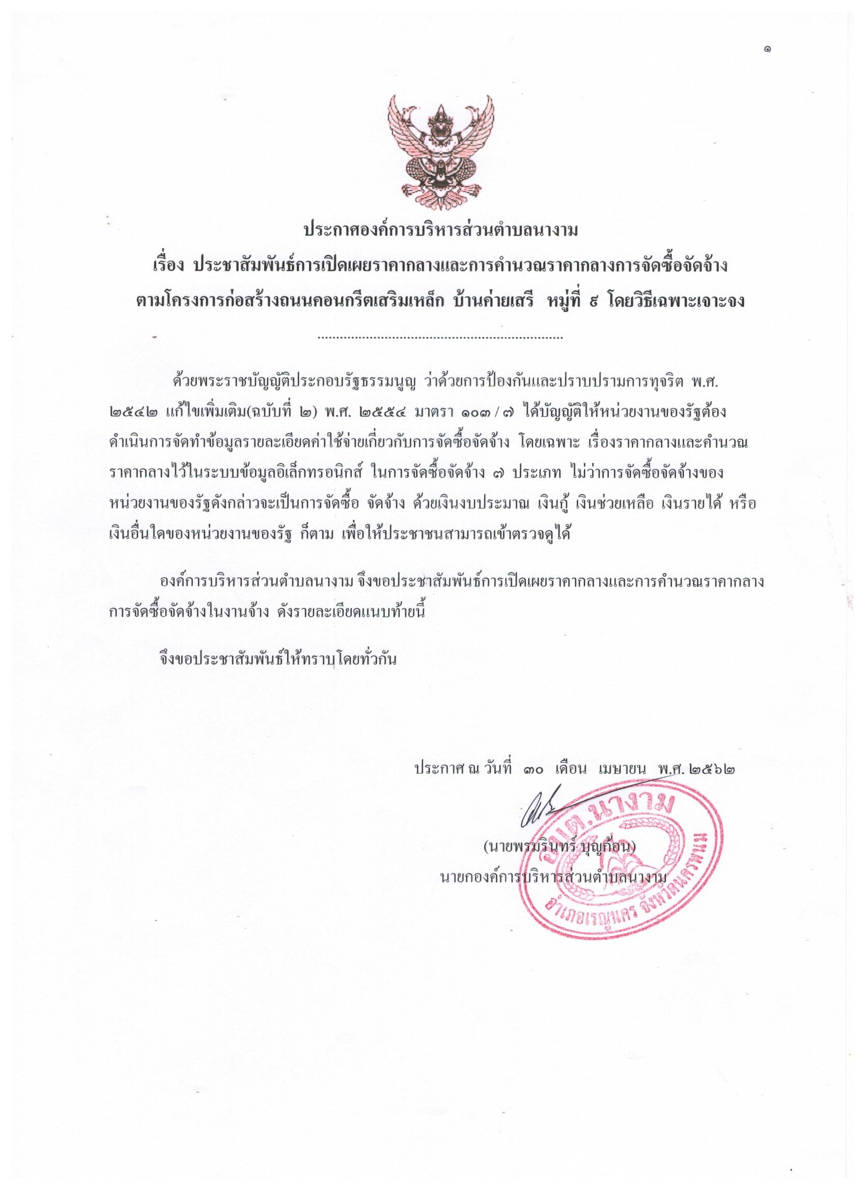 ประชาสัมพันธ์การเปิดเผยราคากลางตามโครงการก่อสร้างถนนคอนกรีตเสริมเหล็ก บ้านค่ายเสรี หมู่ที่ ๙