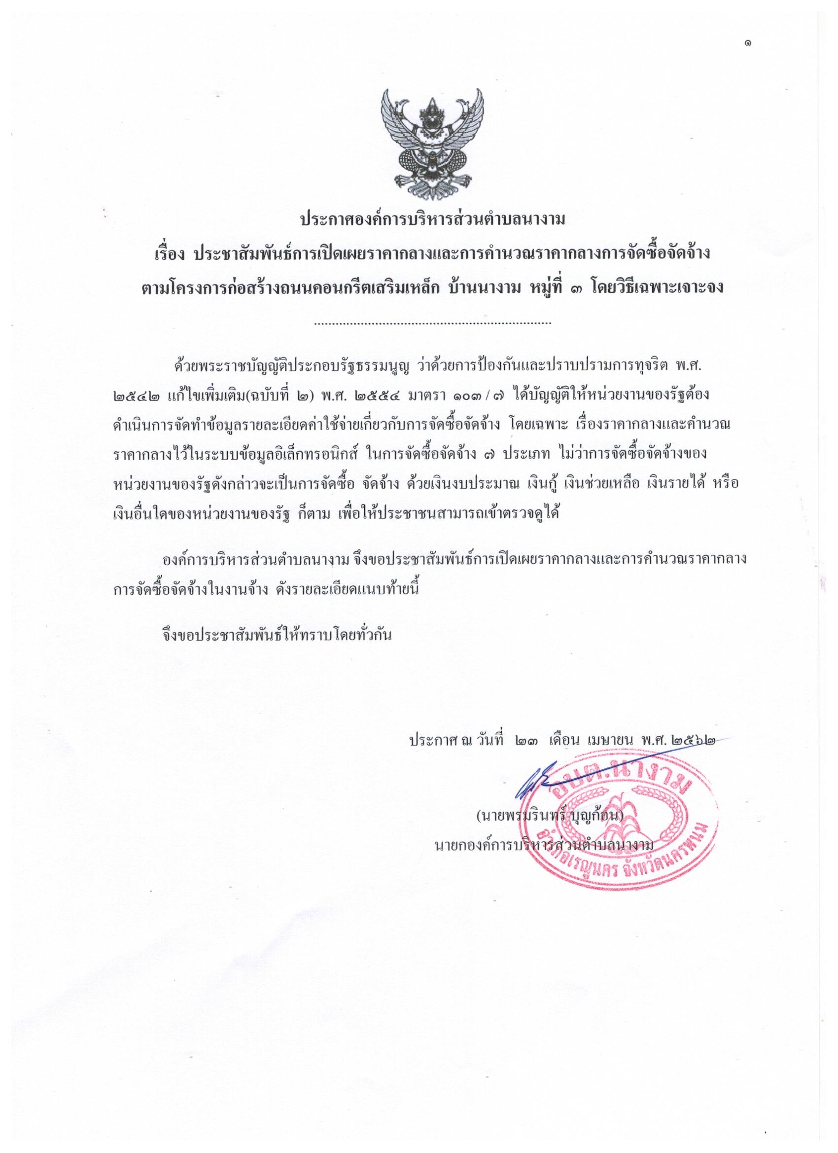 ประชาสัมพันธ์การเปิดเผยราคากลาง ตามโครงการก่อสร้างถนนคอนกรีตเสริมเหล็ก บ้านนางาม หมู่ที่ ๓
