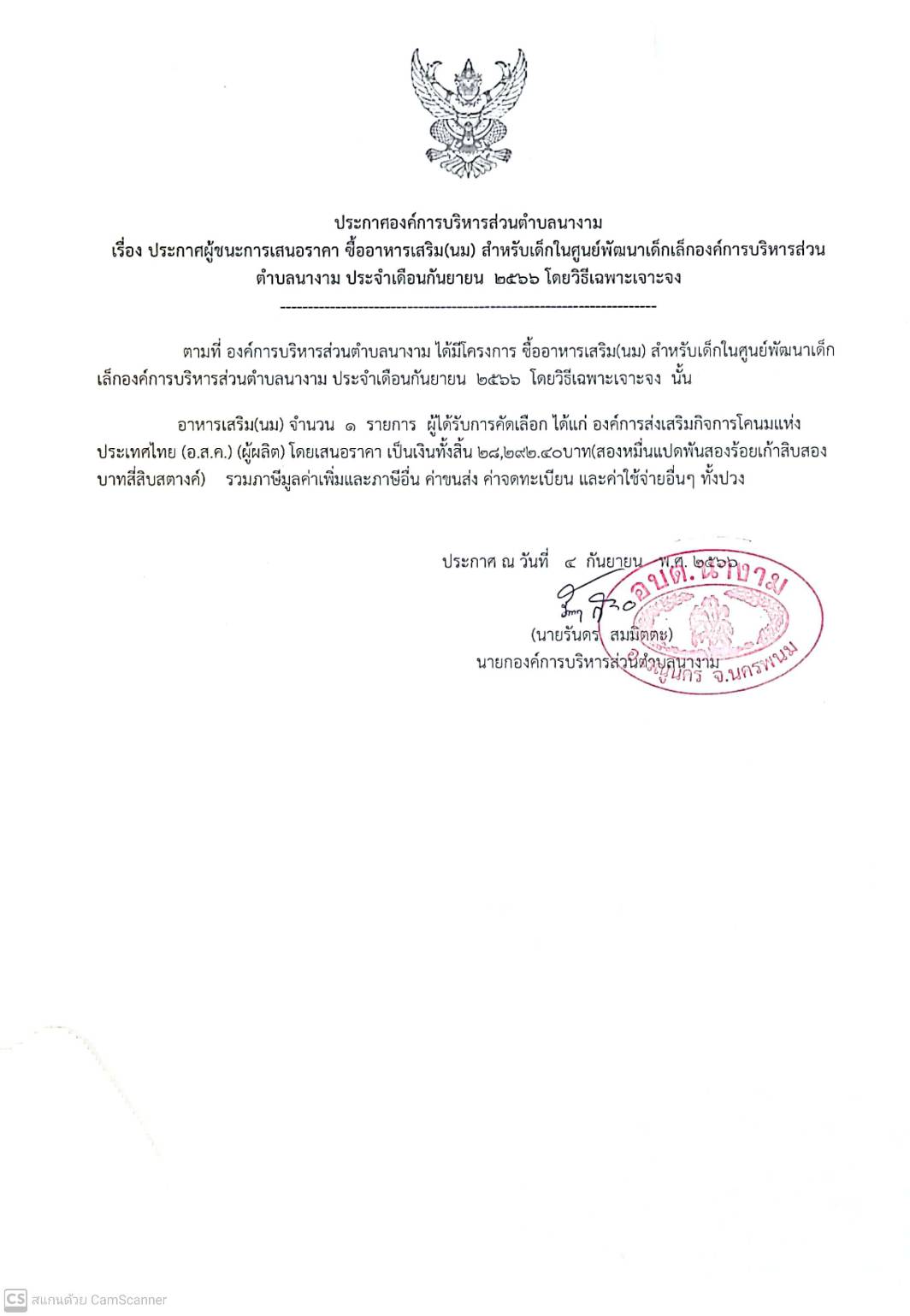 ประกาสผู้ชนะการเสนอราคา ซื้อาหารเสริม(นม) สำหรับเด็กในศูนย์พัฒนาเด็กเล็กองค์การบริหารส่วนตำบลนางาม ประจำเดือนกันยายน 2566 โดยวิธีเฉพาะเจาะจง