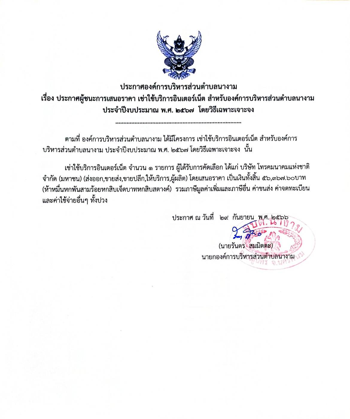 ชื่อเรื่อง : ประกาศผู้ชนะการเสนอราคา เช่าใช้บริการอินเตอร์เน็ต สำหรับองค์การบริหารส่วนตำบลนางาม ประจำปีงบประมาณ พ.ศ. ๒๕๖๗ โดยวิธีเฉพาะเจาะจง