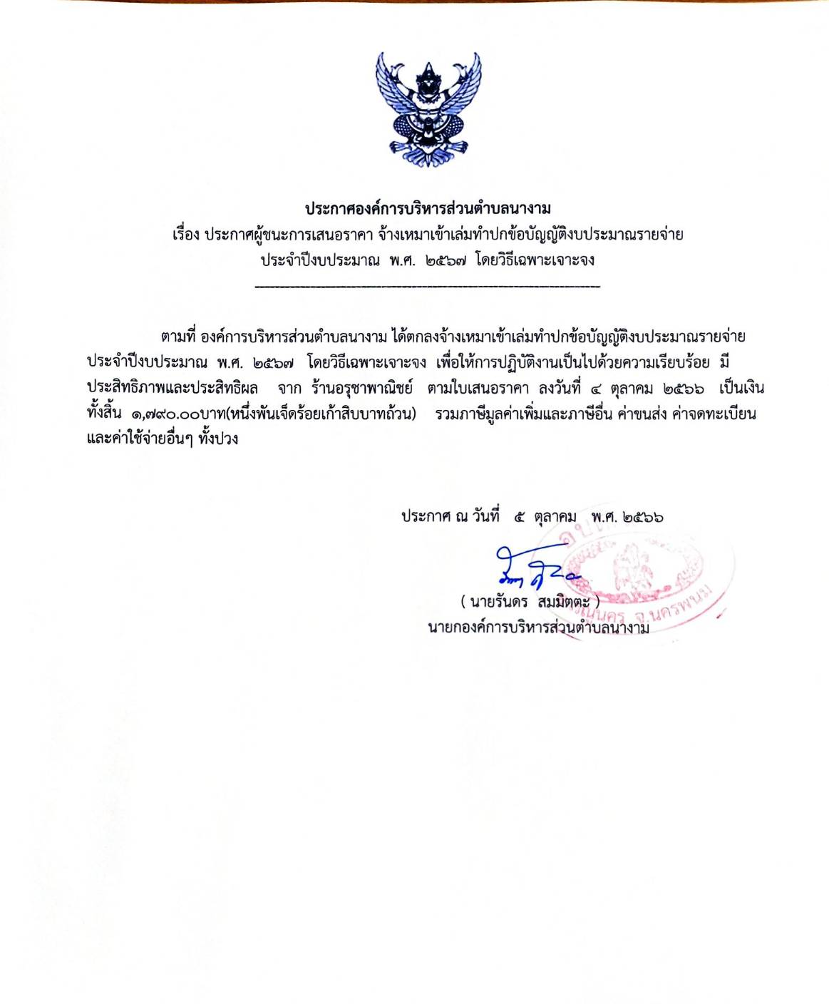 ประกาศผู้ชนะการเสนอราคา จ้างเหมาเข้าเล่มทำปกข้อบัญญัติงบประมาณรายจ่าย ประจำปีงบประมาณ พ.ศ. ๒๕๖๗ โดยวิธีเฉพาะเจาะจง