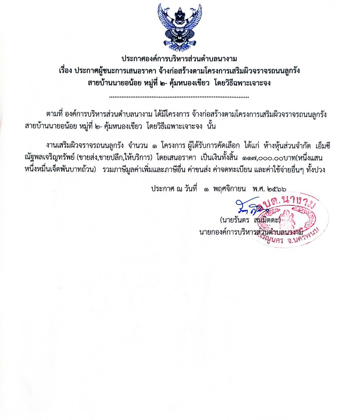 ประกาศผู้ชนะการเสนอราคา จ้างก่อสร้างตามโครงการเสริมผิวจราจรถนนลูกรัง สายบ้านนายอน้อย หมู่ที่ ๒ - คุ้มหนองเขียว โดยวิธีเฉพาะเจาะจง