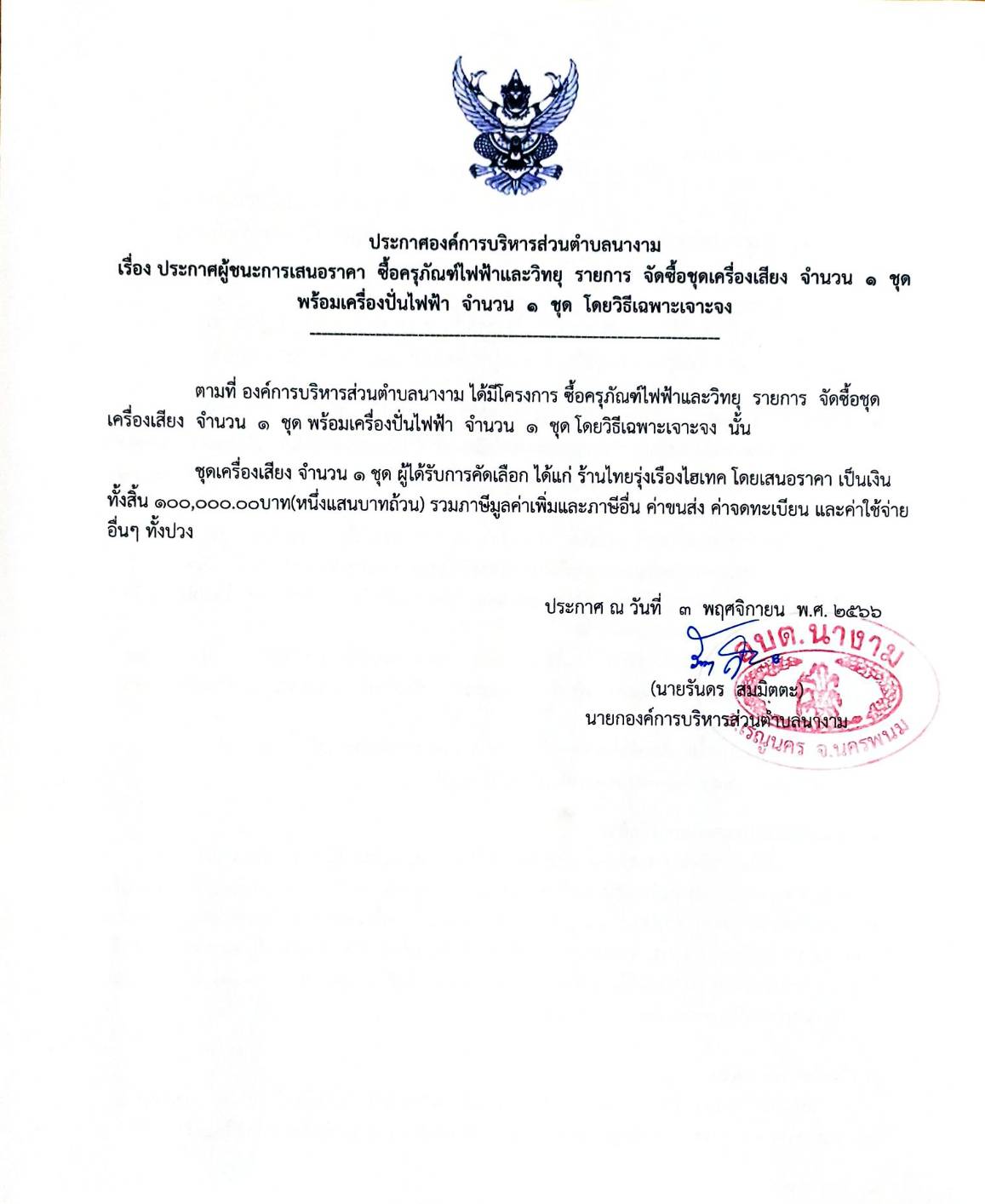 ประกาศผู้ชนะการเสนอราคา ซื้อครุภัณฑ์ไฟฟ้าและวิทยุ รายการ จัดซื้อเครื่องเสียง จำนวน ๑ ชุด พร้อมเครื่องปั่นไฟ จำนวน ๑ ชุด โดยวิธีเฉพาะเจาะจง