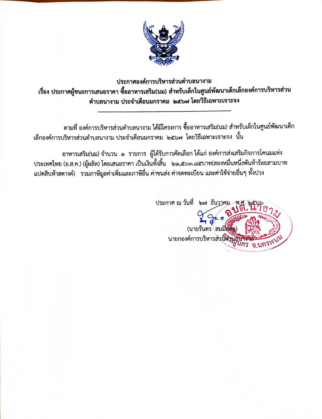 ประกาศผู้ชนะการเสนอราคา ซื้ออาหารเสริม(นม) สำหรับเด็กในศูนย์พัฒนาเด็กเล็กองค์การบริหารส่วนตำบลนางาม ประจำเดือนมกราคม ๒๕๖๗ โดยวิธีเฉพาะเจาะจง