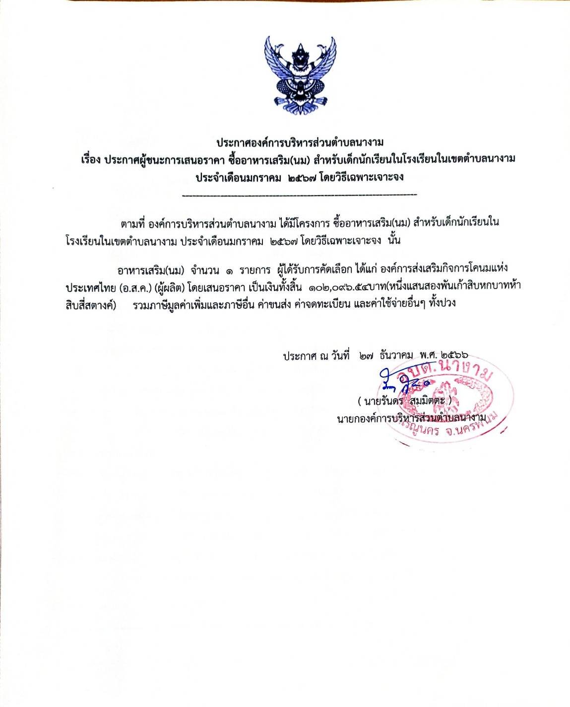 ประกาศผู้ชนะการเสนอราคา ซื้ออาหารเสริม(นม) สำหรับเด็กนักเรียนในโรงเรียนในเขตตำบลนางาม ประจำเดือนมกราคม ๒๕๖๗ โดยวิธีเฉพาะเจาะจง