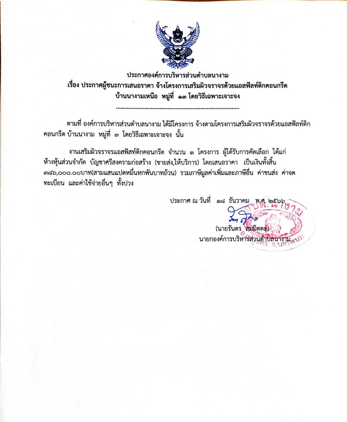 ประกาศผู้ชนะการเสนอราคา จ้างโครงการเสริมผิวจราจรด้วยแอสฟัลท์ติกคอนกรีต บ้านนางามเหนือ หมู่ที่ ๑๓ โดยวิธีเฉพาะเจาะจง