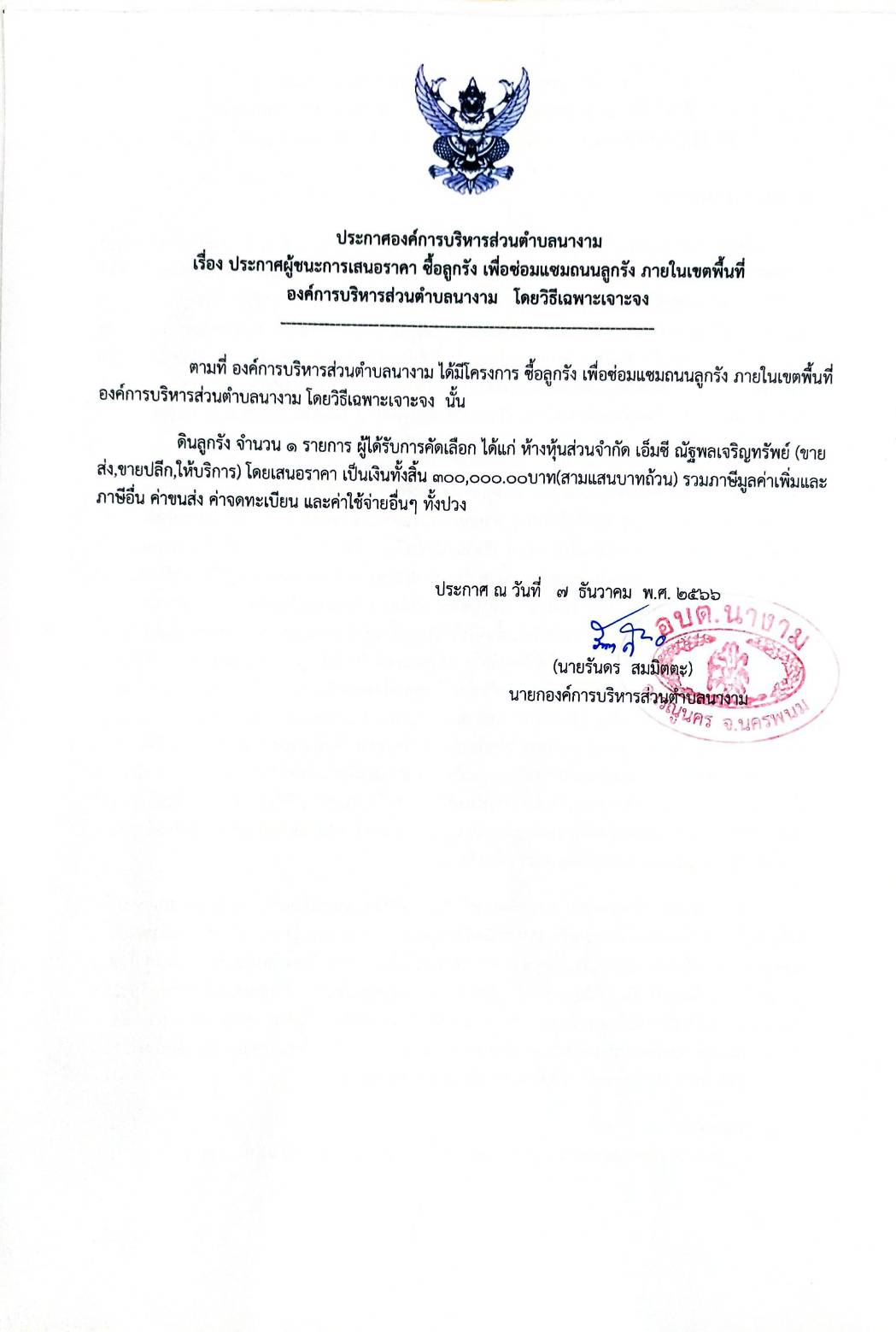 ประกาศผู้ชนะการเสนอราคา ซื้อลูกรัง เพื่อซ่อมแซมถนนลูกรัง ภายในเขตพื้นที่องค์การบริหารส่วนตำบลนางาม โดยวิธีเฉพาะเจาะจง