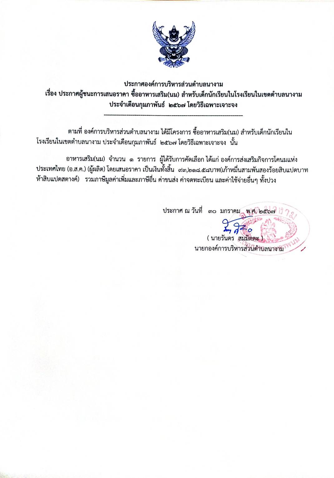 ประกาศผู้ชนะการเสนอราคา ซื้ออาหารเสริม(นม) สำหรับเด็กนักเรียนในโรงเรียนในเขตตำบลนางาม ประจำเดือนกุมภาพันธ์ ๒๕๖๗ โดยวิธีเฉพาะเจาะจง