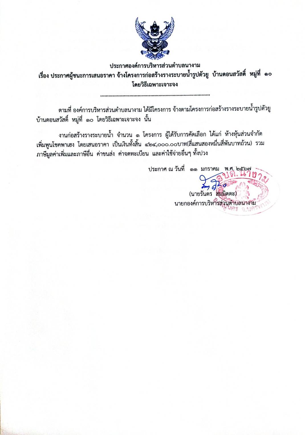 ประกาศผู้ชนะการเสนอราคา จ้างโครงการก่อสร้างรางระบายน้ำรูปตัวยู บ้านดอนสวัสดิ์ หมู่ที่ ๑๐ โดยวิธีเฉพาะเจาะจง