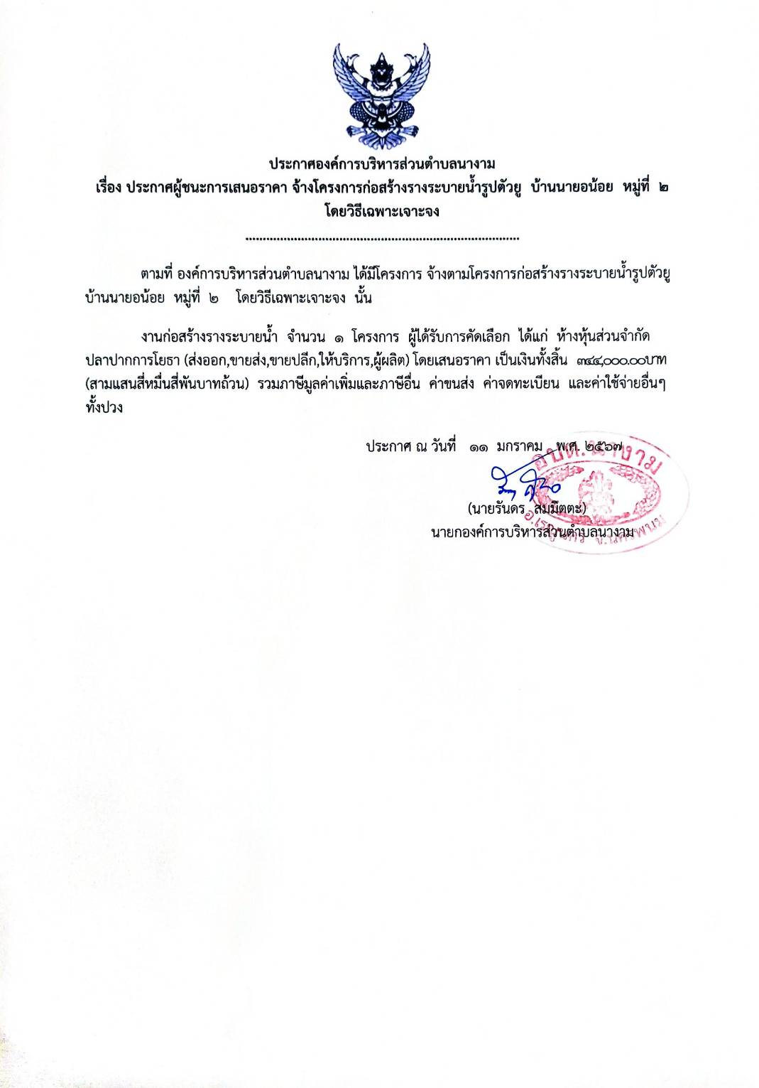 ประกาศผู้ชนะการเสนอราคา จ้างโครงการก่อสร้างรางระบายน้ำรูปตัวยู บ้านนายอน้อย หมู่ที่ ๒ โดยวิธีเฉพาะเจาะจง