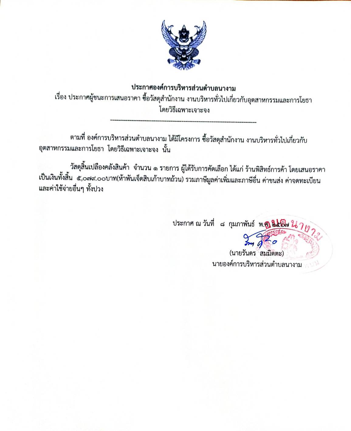 ประกาศผู้ชนะการเสนอราคา ซื้อวัสดุสำนักงาน งานบริหารทั่วไปเกี่ยวกับอุตสาหกรรมและการโยธา โดยวิธีเฉพาะเจาะจง