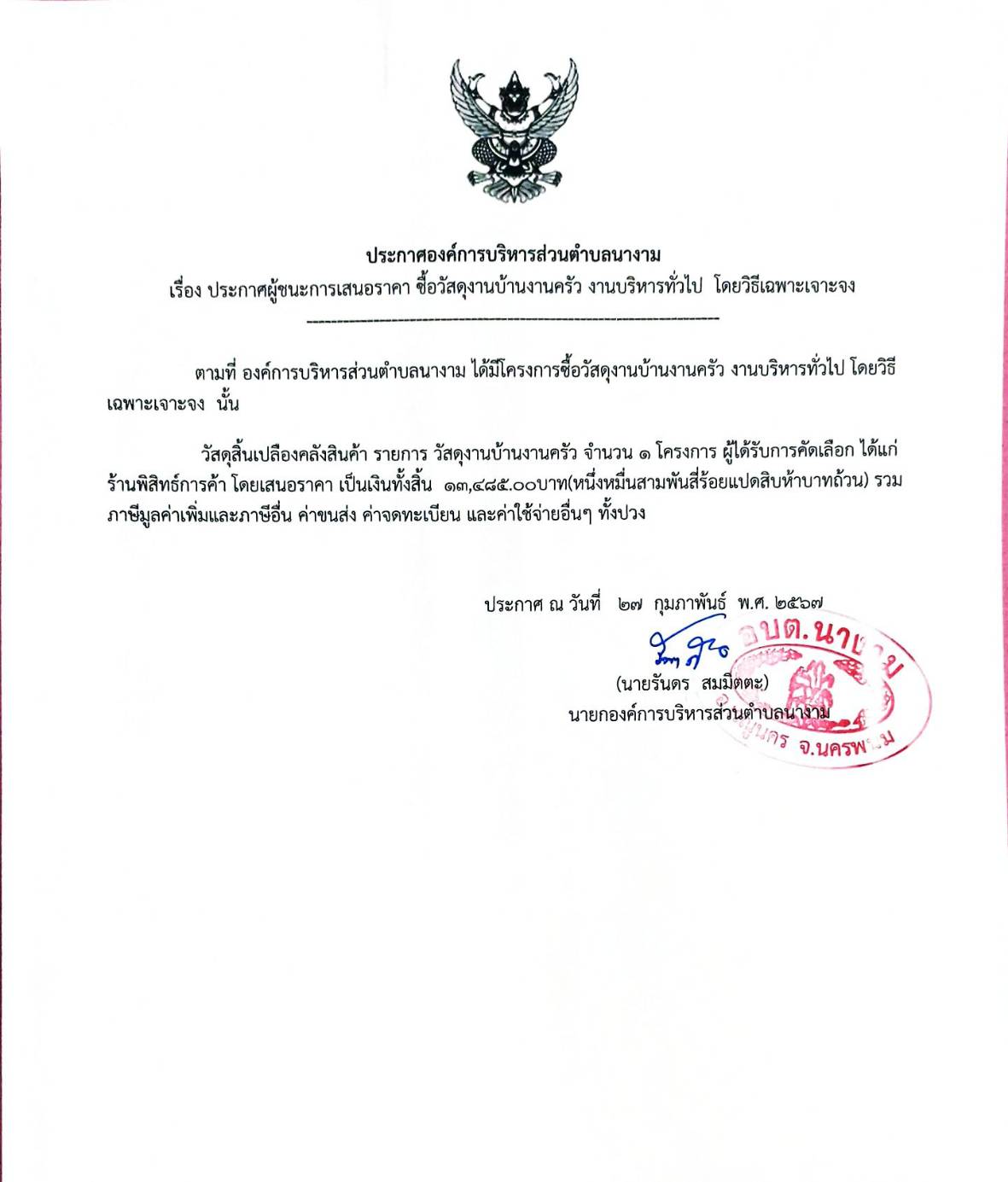 ประกาศผู้ชนะการเสนอราคา ซื้อวัสดุงานบ้านงานครัว งานบริหารทั่วไป โดยวิธีเฉพาะเจาะจง